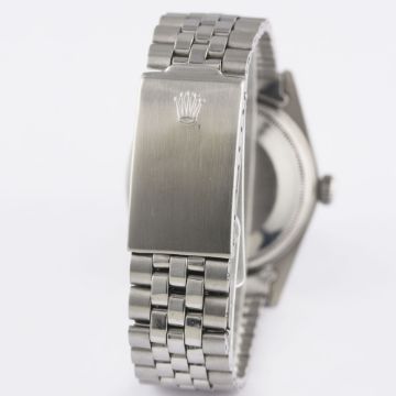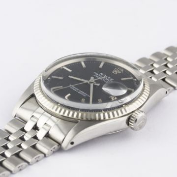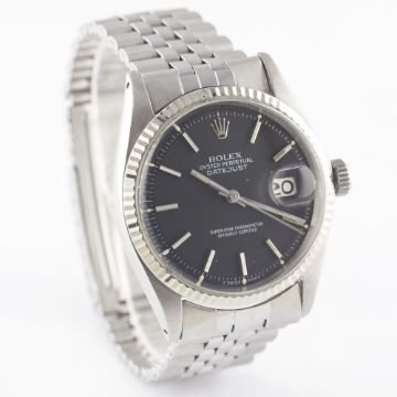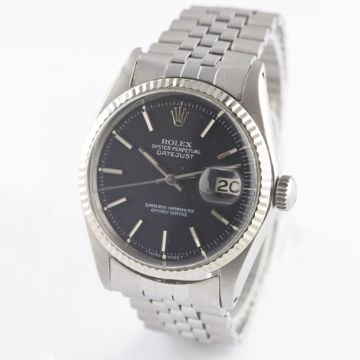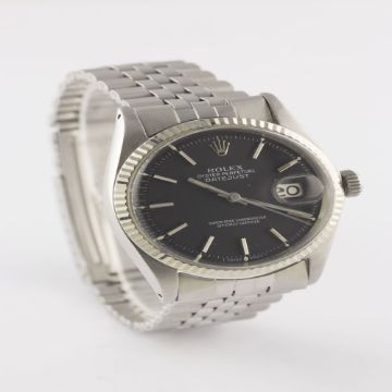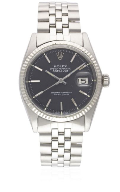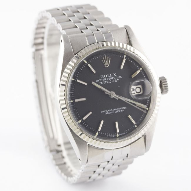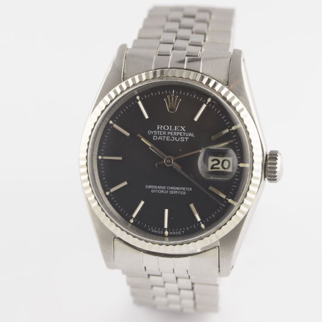 A GENTLEMAN'S STEEL & WHITE GOLD ROLEX OYSTER PERPETUAL DATEJUST BRACELET WATCHDATED 1970, REF. 1601 WITH MATT BLACK DIAL, ACCOMPANIED BY THE ORIGINAL CHRONOMETER CERTIFICATE, GUARANTEE & SERVICE PAPERWORK FROM 1979 Movement: 26J, automatic chronometer, cal. 1570, signed Montres Rolex S.A., numbered.Case: Diameter approx. 36mm, Oyster case, signed Montres Rolex S.A., dated I.70, numbered, solid white gold fluted bezel, Rolex crown.Bracelet: Rolex Jubilee bracelet, numbered 6251H/55. CONDITION REPORTDial: Original dial in excellent condition.Movement: Working at present.Case: In excellent condition, with some small scratches due to general use.Strap/Bracelet: In very good condition, with some light scratches due to general use.
