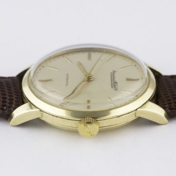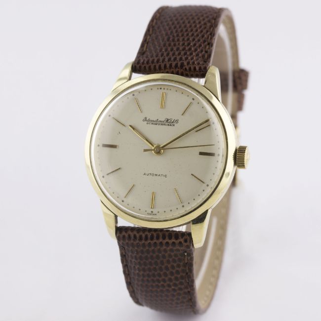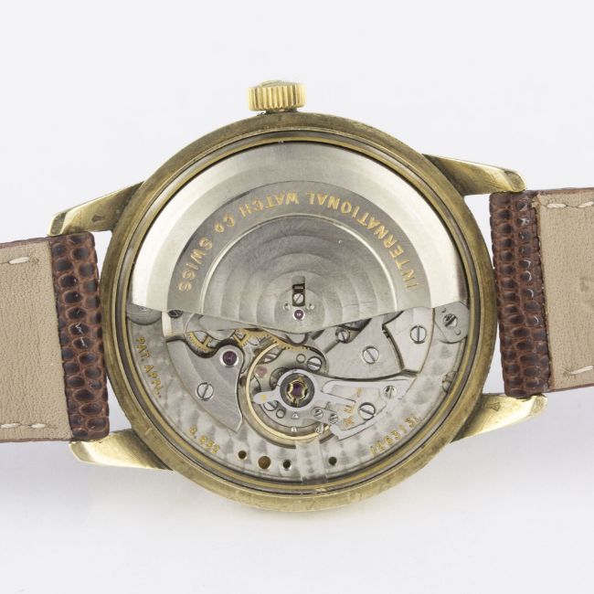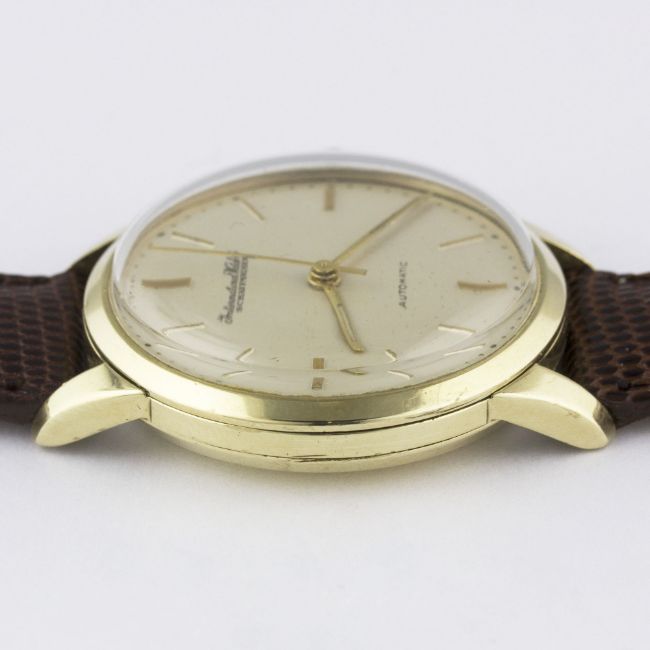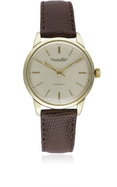 A GENTLEMAN'S 9CT SOLID GOLD IWC SCHAFFHAUSEN AUTOMATIC WRIST WATCH CIRCA 1960s Movement: 21J, automatic, cal. 852, signed International Watch Co, numbered. Case: Diameter approx. 34mm, snap back, signed International Watch Co, numbered, 9ct hallmarks, IWC crown.Strap: Leather. CONDITION REPORTDial: Original dial in very good condition, showing some small signs of age.Movement: Working at present.Case: In excellent condition, with some light scratches due to general use.Strap/Bracelet: In excellent condition.