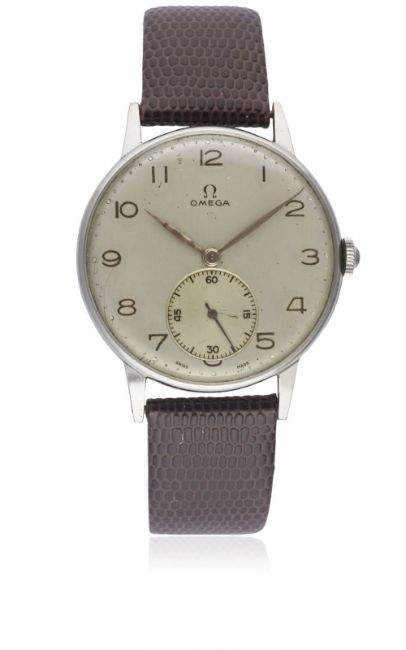 A GENTLEMAN'S LARGE SIZE STAINLESS STEEL OMEGA WRIST WATCH CIRCA 1944, REF. 2319/2 Movement: 15J, manual wind, cal. 30T2, signed Omega, numbered. Case: Diameter approx. 37mm, snap back, signed Omega Watch Co, Omega crown.Strap: Leather.  CONDITION REPORTDial: Original dial in good condition, showing signs of age.Movement: Working at present.Case: In very good condition, with some light scratches due to general use.Strap/Bracelet: In excellent condition.
