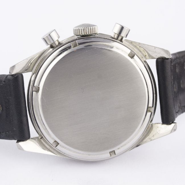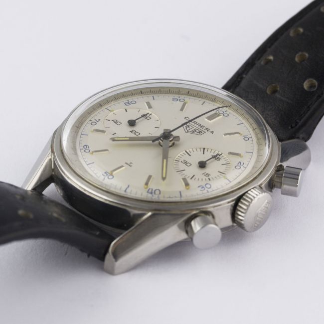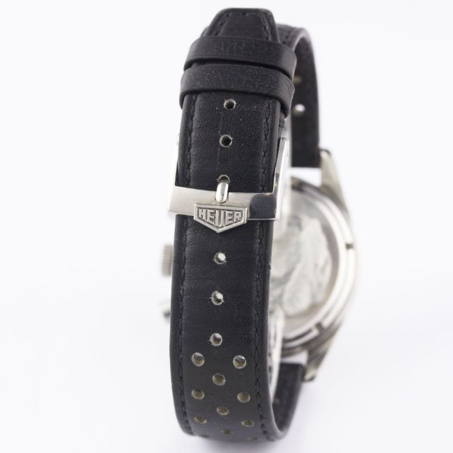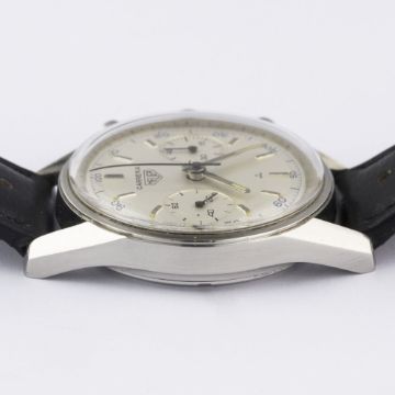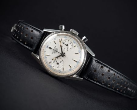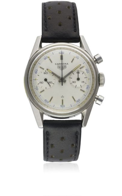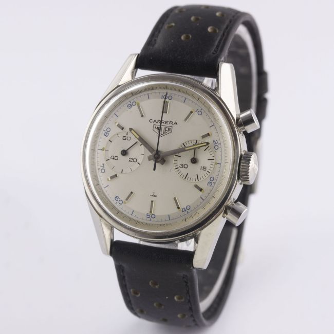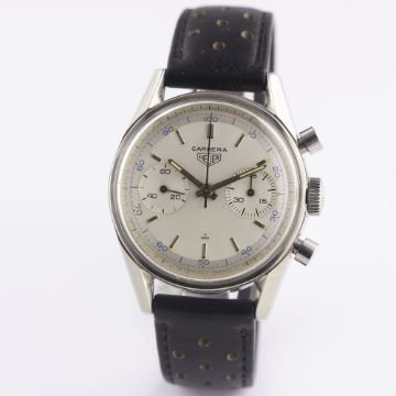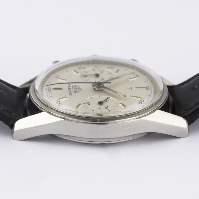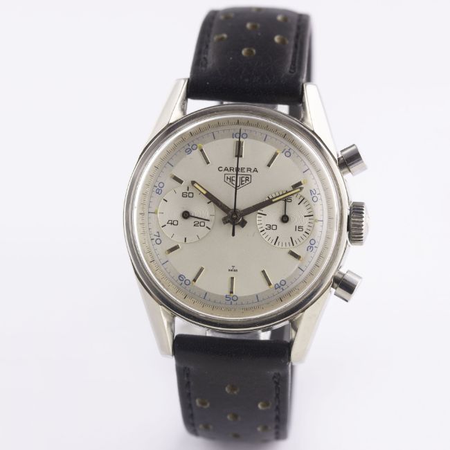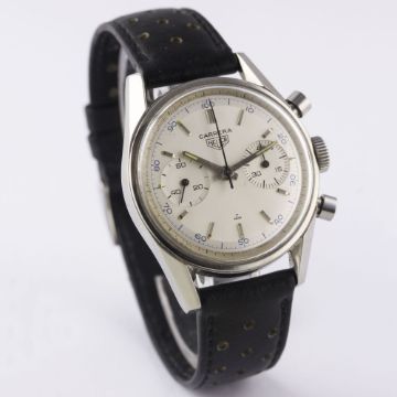 A RARE GENTLEMAN'S STAINLESS STEEL HEUER CARRERA 45 DECIMAL CHRONOGRAPH WRIST WATCHCIRCA 1960s, REF. 3647DMovement: 17J, manual wind, Valjoux cal. 92, signed Heuer-Leonidas SA.Case: Diameter approx. 36mm, screw back, signed Heuer-Leonidas SA, Heuer crown.Strap: Leather strap with Heuer pin buckle. CONDITION REPORTDial: Original dial in excellent condition, outer minute tracking is showing signs of age.Movement: Working at present.Case: In excellent condition, with some light scratches due to general use.Strap/Bracelet: In good condition.