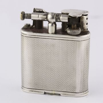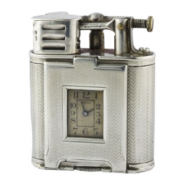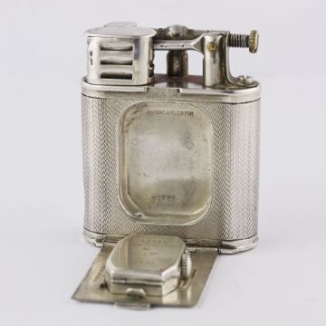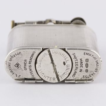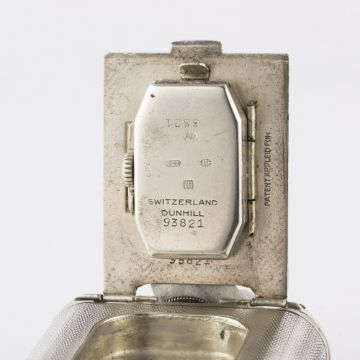 A RARE SOLID SILVER DUNHILL UNIQUE B SPORTS WATCH LIGHTER CIRCA 1927, LARGER MODEL MADE BY DUNHILL'S SWISS PARTNER LA NATIONALE FOR THE NORTH AMERICAN MARKET Movement: 15J, manual wind, signed Dunhill.Case: Approx. 54mm by 45mm, engine turned design, signed Dunhill Unique Sports Lighter, Made in Switzerland, silver 925 import marks, numbered. CONDITION REPORTDial: Original dial in good condition showing an even patina.Movement: Working at present.Case: In fair condition, with some ware and dents due to use.