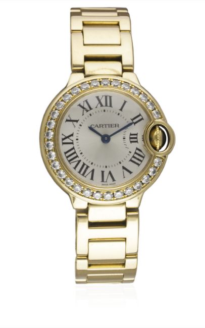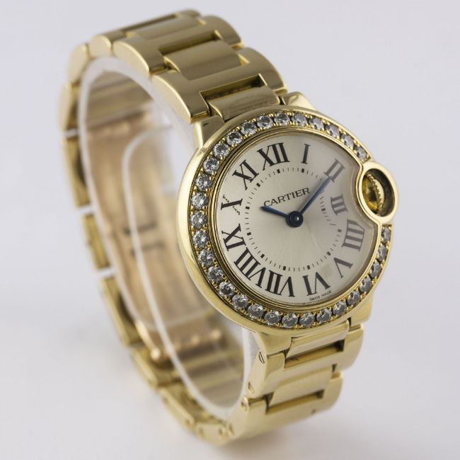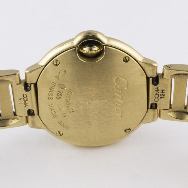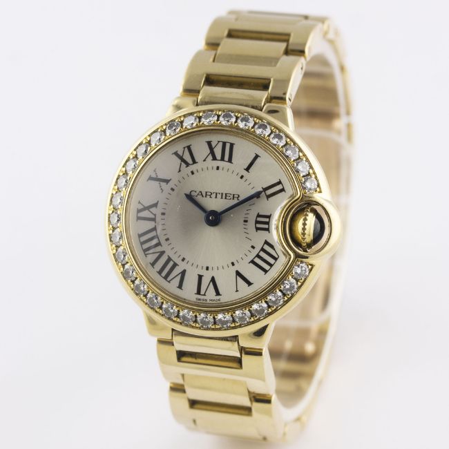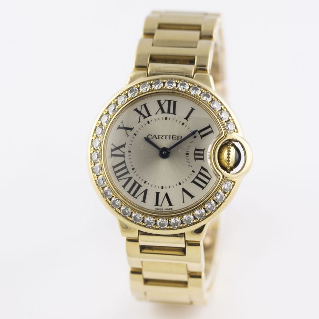 A FINE LADIES 18K SOLID GOLD & DIAMOND CARTIER BALLON BLEU BRACELET WATCHCIRCA 2007, REF. 3006 WITH CARTIER BOXMovement: Quartz, signed Cartier.Case: Diameter approx. 28mm, signed Cartier, numbered, diamond set bezel, 18k hallmarks, sapphire crown. Bracelet: Original Cartier Ballon Bleu 18k solid gold bracelet, total length approx. 162mm. CONDITION REPORTDial: Original dial in excellent condition.Movement: Working at present.Case: In excellent condition, with some light scratches due to general use.Strap/Bracelet: In excellent condition.