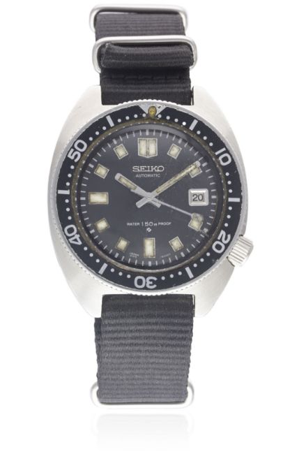 A GENTLEMAN'S STAINLESS STEEL SEIKO 150M AUTOMATIC DIVERS WRIST WATCHCIRCA 1970s, REF. 6105-8000Movement: 17J, automatic, quick-set date, cal. 6105A, signed Seiko. Case: Width approx. 41mm, screw back, signed Seiko, numbered, 60 minute rotating bezel, Seiko crown.Strap: NATO. CONDITION REPORTDial: Original dial in excellent condition.Movement: Working at present.Case: In very good condition, with some small scratches due to general use, one small area of discolouration to bezel insert between 30 and 40. Strap/Bracelet: In excellent condition.