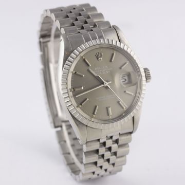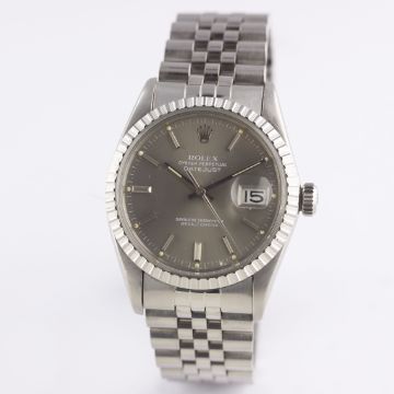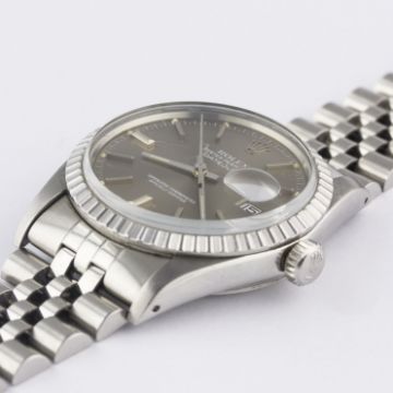 A GENTLEMAN'S STAINLESS STEEL ROLEX OYSTER PERPETUAL DATEJUST BRACELET WATCHCIRCA 1982, REF. 16030 WITH SUNBURST GREY DIALMovement: 27J, automatic chronometer, quick-set date, cal. 3035, signed Rolex S.A., numbered.Case: Diameter approx. 36mm, Oyster case, signed Montres Rolex S.A., numbered, milled bezel, Rolex crown.Bracelet: Original Rolex Jubilee bracelet, numbered 62510H/555. CONDITION REPORTDial: Original dial in excellent condition.Movement: Working at present.Case: In very good condition, with some scratches due to general use.Strap/Bracelet: In very good condition with some scratches due to general use.