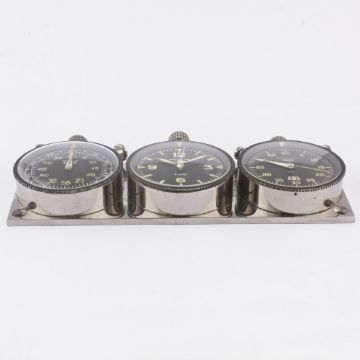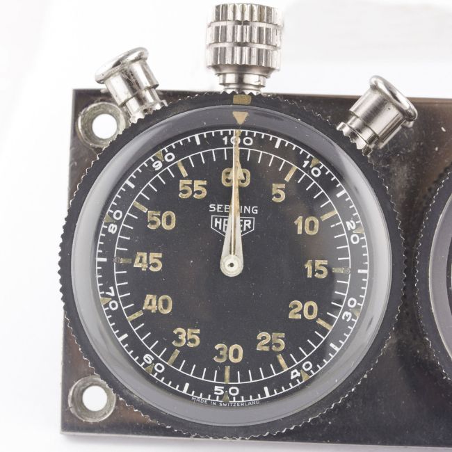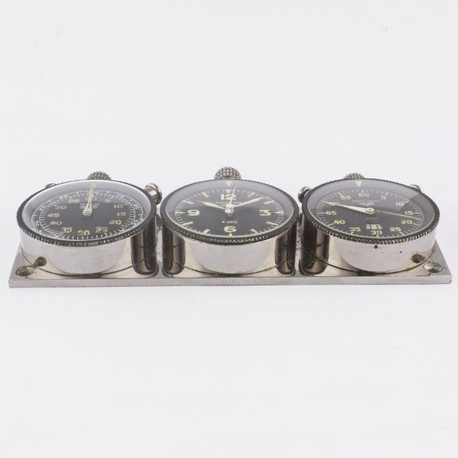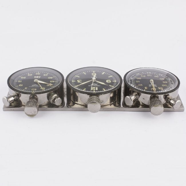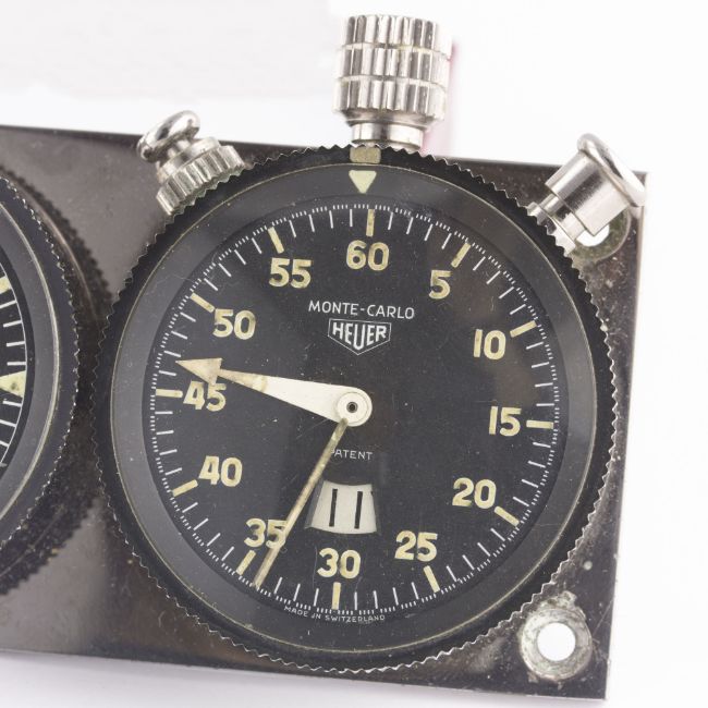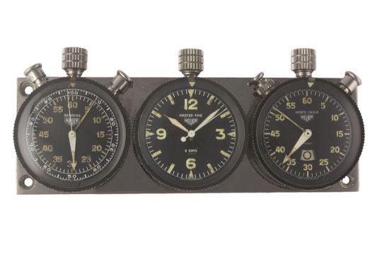 A RARE HEUER TRIPLE DASHBOARD SET CIRCA 1960s, CONSISTING OF A SEBRING 60 MINUTE SPLIT SECONDS TIMER, 8 DAY MASTER TIME CLOCK AND A MONTE CARLO TIMERMovement: Manual wind.Case: Original base plate approx. 170mm by 58mm, rotating bezel diameters approx. 54mm, signed Ed Heuer & Co. Swiss. CONDITION REPORTDial: Original dials in excellent condition, showing some small signs of age.Movement: Working at present.Case: In excellent condition, with light scratches due to general use.