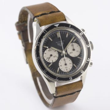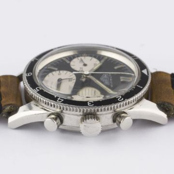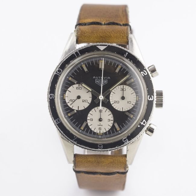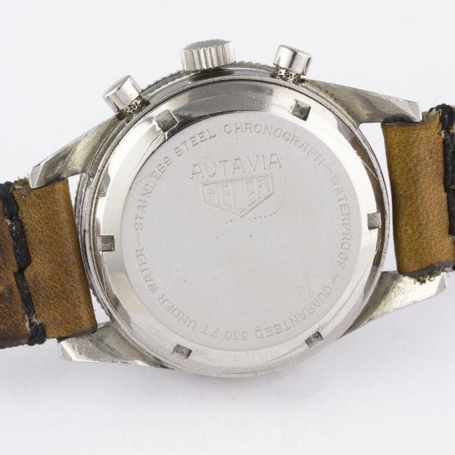 A RARE GENTLEMAN'S STAINLESS STEEL HEUER AUTAVIA CHRONOGRAPH WRIST WATCH CIRCA 1968, REF. 2446 WITH 3RD EXECUTION DIAL, THE MODEL WORN BY JOCHEN RINDT, THE POSTHUMOUS 1970 FORMULA ONE WORLD CHAMPION, A SEASON IN WHICH HE TRAGICALLY SUFFERED A FATAL ACCIDENT IN A PRACTICE SESSION AT MONZA, ITALYMovement: 17J, manual wind, Valjoux cal. 72, signed Heuer-Leonidas SA.Case: Diameter approx. 39mm, 2nd execution, screw back, signed Heuer-Leonidas S.A., signed Heuer Autavia on case back, numbered, 12 hour rotating bezel.Strap: Leather. CONDITION REPORTDial: Original dial in excellent condition, showing some small signs of age.Movement: Working at present.Case: In very good condition, with some small scratches due to general use.Strap/Bracelet: In fair condition.