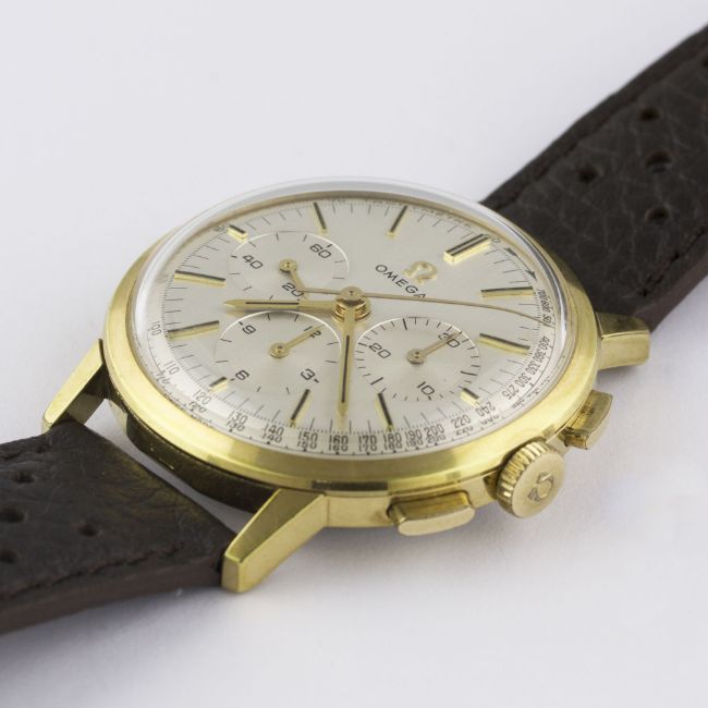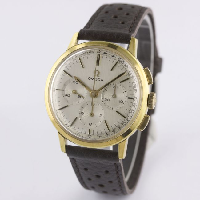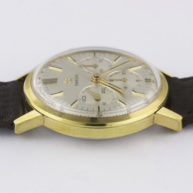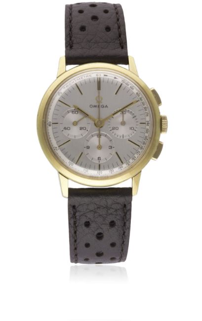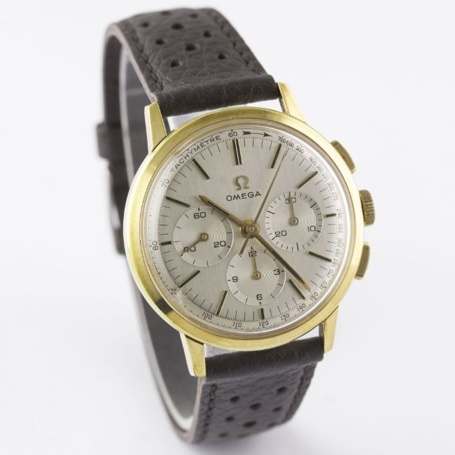 A RARE GENTLEMAN'S GOLD PLATED OMEGA CHRONOGRAPH WRIST WATCH CIRCA 1965, REF. 101.010-63 WITH OMEGA BOXMovement: 17J, manual wind, cal. 321, signed Omega, numbered. Case: Diameter approx. 35mm, steel snap back, signed Omega Watch Co, Omega crown.Strap: Perforated leather. CONDITION REPORTDial: Original dial in excellent condition.Movement: Working at present.Case: In excellent condition, with some light scratches due to occasional use.Strap/Bracelet: In excellent condition.