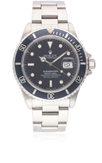 A GENTLEMAN'S STAINLESS STEEL ROLEX OYSTER PERPETUAL DATE SUBMARINER BRACELET WATCHCIRCA 1990, REF. 16610 Movement: 31J, automatic chronometer, quick-set date, cal. 3135, signed Montres Rolex S.A., numbered.Case: Diameter approx. 40mm, Oyster case, signed Montres Rolex S.A., E serial no., sapphire crystal, 60 minute rotating bezel faded to blue-grey, Rolex triplock crown.Bracelet: Original Rolex Oyster Submariner bracelet, numbered P10/91350/501B. CONDITION REPORTDial: Original dial in very good condition, showing some small signs of age.Movement: Working at present.Case: In excellent condition, with some light scratches due to general use.Strap/Bracelet: In very good condition.