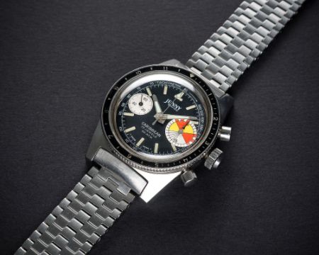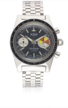 A RARE GENTLEMAN'S STAINLESS STEEL JENNY CARIBBEAN YACHTING CHRONOGRAPH BRACELET WATCH CIRCA 1968, REF. 2002Movement: 17J, manual wind, Valjoux cal. 7733.Case: Width approx. 38mm, screw back, spear-diving scene engraved on case back, numbered, 12 hour rotating bakelite bezel, screw-down crown.Bracelet: Original Jenny bracelet. CONDITION REPORTDial: Original dial in excellent condition.Movement: Working at present.Case: In excellent condition, with some light scratches due to general use.Strap/Bracelet: In very good condition, with light scratches due to general use.