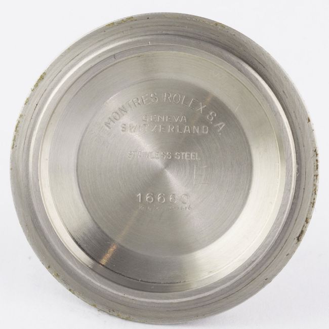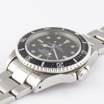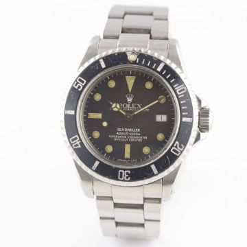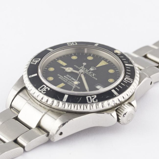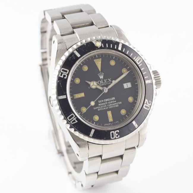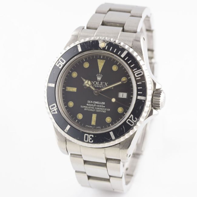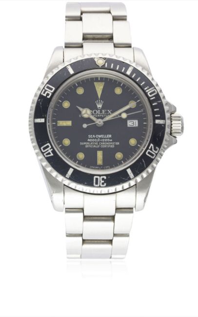 A RARE GENTLEMAN'S STAINLESS STEEL ROLEX OYSTER PERPETUAL DATE SEA DWELLER "TRIPLE SIX" BRACELET WATCHCIRCA 1984, REF. 16660 "TRANSITIONAL" MODEL WITH MATT DIAL, ACCOMPANIED BY THE ORIGINAL BOX, PAPERWORK & TOOL Movement: 27J, automatic chronometer, quick-set date, cal. 3035, signed Rolex S.A., numbered.Case: Diameter approx. 40mm, Oyster case, signed Montres Rolex S.A., numbered, gas escape valve, sapphire crystal, 60 minute rotating bezel, Rolex triplock crown.Bracelet: Rolex Oyster Sea Dweller bracelet, numbered S AB4/91360/592. CONDITION REPORTDial: Original dial in very good condition, showing a strong patina.Movement: Working at present.Case: In very good condition, with some small scratches & scuffs due to general use.Strap/Bracelet: In fair condition.