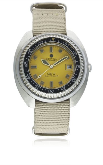 A RARE GENTLEMAN'S STAINLESS STEEL CERTINA DS2 SUPER PH 1000M AUTOMATIC DIVERS WRIST WATCH CIRCA 1970, REF. 5801 302 WITH YELLOW DIAL & "SWORD" HANDSMovement: 28J, automatic, cal. 25-651, signed Certina. Case: Width approx. 45mm, screw back, signed Certina, FR engraved on case back, 60 minute rotating bakelite bezel on spring ratchet system, Certina screw-down crown.Strap: NATO. CONDITION REPORTDial: Original dial in very good condition, showing some signs of age.Movement: Working at present.Case: In very good condition, with small scratches due to general use, some wear to bakelite bezel.Strap/Bracelet: In excellent condition.