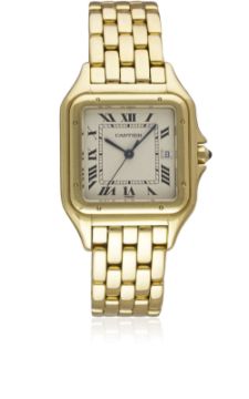 A GENTLEMAN'S SIZE 18K SOLID GOLD CARTIER PANTHERE BRACELET WATCHCIRCA 2000Movement: Quartz, signed Cartier.Case: Width approx. 28mm, signed Cartier, numbered, 18k hallmarks, sapphire crown. Bracelet: Original Cartier Panthere 18k solid gold bracelet. CONDITION REPORTDial: Original dial in excellent condition.Movement: Working at present.Case: In excellent condition, with some light scratches due to general use.Strap/Bracelet: In excellent condition with some light scratches due to general use