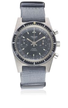 A GENTLEMAN'S ORIOSA DIVERS CHRONOGRAPH WRIST WATCH CIRCA 1960s, WITH GLOSS BLACK DIALMovement: 17J, manual wind.Case: Width approx. 38mm, chrome plated, steel screw back, 60 minute rotating bezel.Strap: NATO. CONDITION REPORTDial: Original dial in excellent condition.Movement: Working at present.Case: In very good condition, with some light scratches due to general use.Strap/Bracelet: In excellent condition.