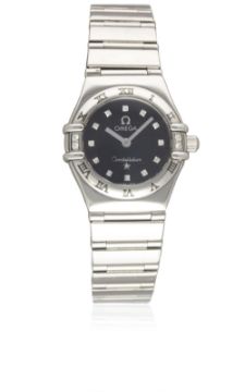 A LADIES STAINLESS STEEL & DIAMOND OMEGA CONSTELLATION "MY CHOICE" BRACELET WATCH  CIRCA 1999Movement: Quartz, signed Omega.  Case: Diameter approx. 24mm, Constellation emblem embossed, signed, numbered, Omega crown. Bracelet: Original Omega Constellation bracelet. CONDITION REPORTDial: Original dial in excellent condition.Movement: Working at present.Case: In excellent condition.Strap/Bracelet: In excellent condition, with some light scratches due to general use.
