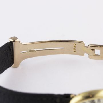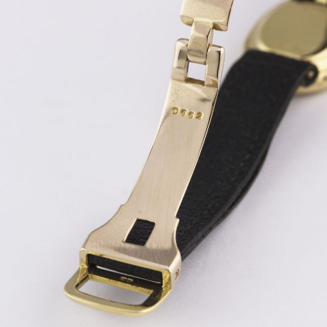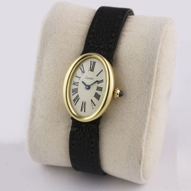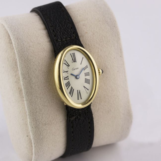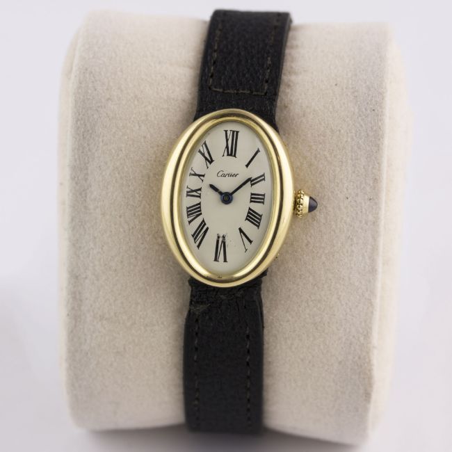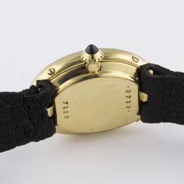 A RARE LADIES 18K SOLID GOLD CARTIER LONDON BAIGNOIRE WRIST WATCHCIRCA 1960s, WITH LONDON HALLMARKS Movement: Manual wind, signed Jaeger-LeCoultre.Case: Approx. 25mm by 18mm, marked JC, numbered, 18k London hallmark letter (i), sapphire crown. Strap: Leather strap with original 18k solid gold deployment clasp with London hallmarks. CONDITION REPORTDial: Dial in excellent condition.Movement: Working at present.Case: In excellent condition, with some light scratches due to general use.Strap/Bracelet: In good condition.