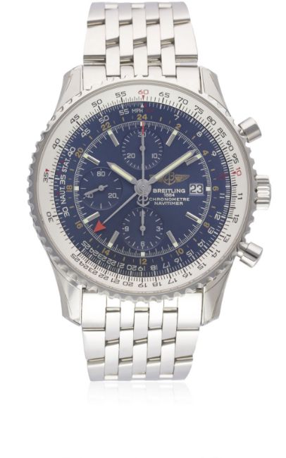 A GENTLEMAN'S UNWORN STAINLESS STEEL BREITLING NAVITIMER WORLD AUTOMATIC CHRONOGRAPH BRACELET WATCH CIRCA 2016, REF. A24322 WITH BLUE DIAL, ACCOMPANIED BY ORIGINAL BOX, BOOKLETS & CHRONOMETER CERTIFICATEMovement: Automatic chronometer, signed Breitling, numbered.Case: Diameter approx. 46mm, signed, numbered, rotating slide rule inner bezel, Breitling crown.Bracelet: Original Breitling bracelet with flip-lock clasp. CONDITION REPORTDial: Original dial in excellent condition.Movement: Working at present.Case: In excellent condition.Strap/Bracelet: In excellent condition.The watch has the protective case and clasp stickers and still applied.