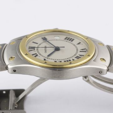 A GENTLEMAN'S STEEL & GOLD CARTIER SANTOS RONDE AUTOMATIC BRACELET WATCHDATED 1997, REF. 1910 WITH BOX & PAPERSMovement: Automatic, signed Cartier.Case: Diameter approx. 34mm, signed Cartier, numbered, solid gold bezel, sapphire crown. Bracelet: Cartier Santos steel & solid gold bracelet. CONDITION REPORTDial: Original dial in excellent condition.Movement: Working at present.Case: In excellent condition, with some light scratches due to general use.Strap/Bracelet: In excellent condition.