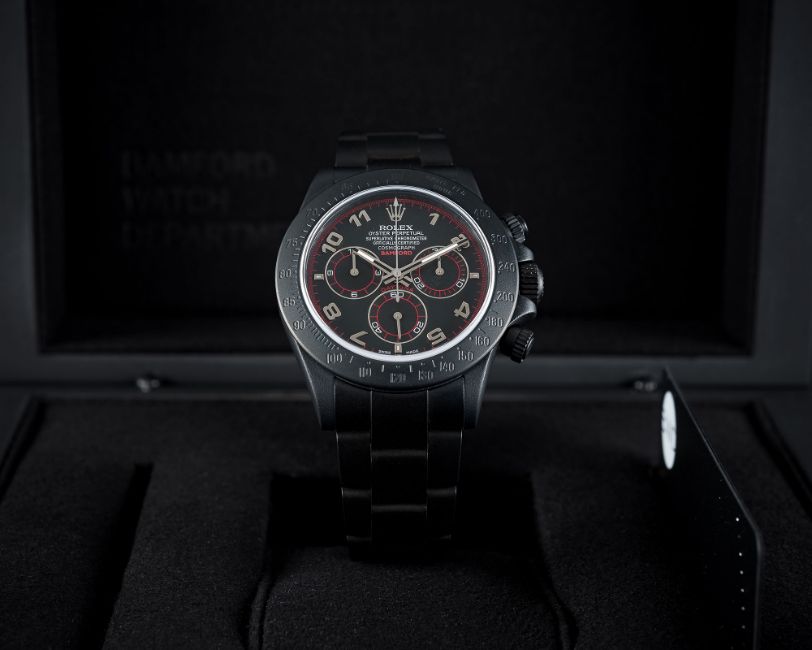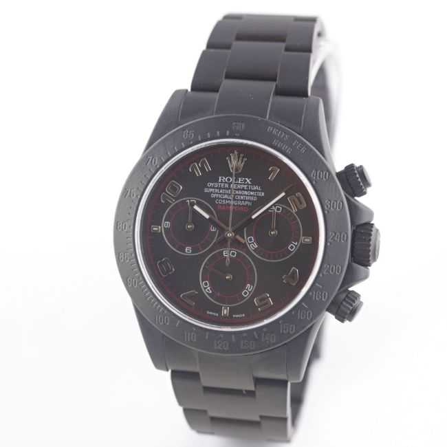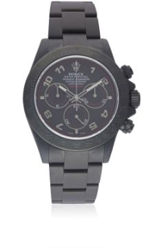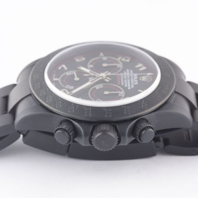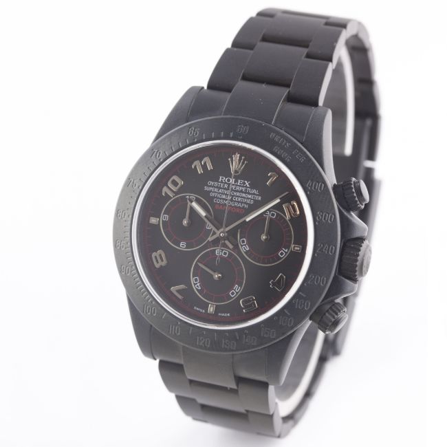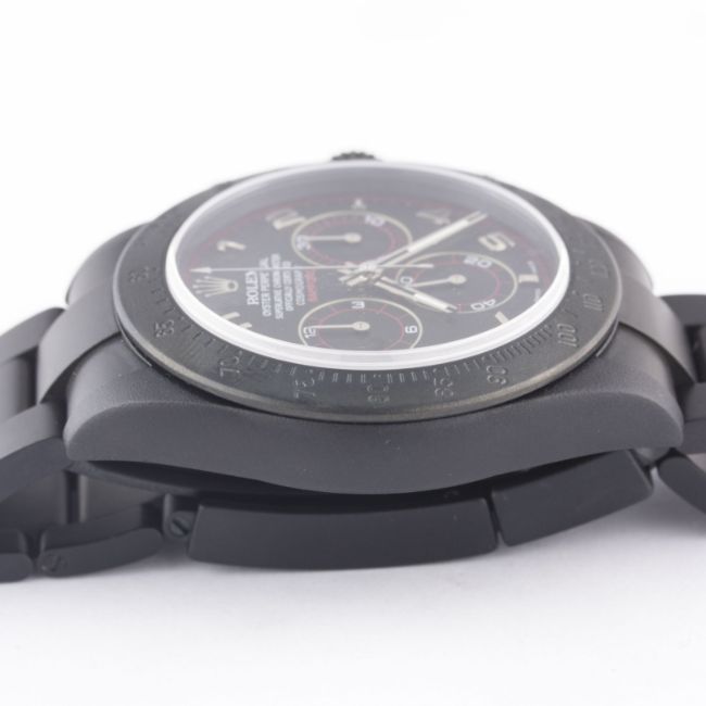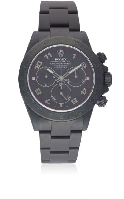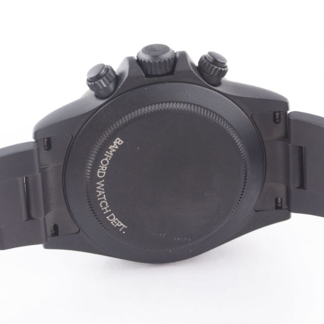 A GENTLEMAN'S PVD COATED STAINLESS STEEL BAMFORD ROLEX OYSTER PERPETUAL COSMOGRAPH DAYTONA BRACELET WATCHDATED 2016, REF. 116520 WITH "RACING" DIAL, ACCOMPANIED BY THE ORIGINAL BAMFORD WATCH DEPARTMENT BOX & WARRANTY CARD Movement: Automatic chronometer, signed Rolex, numbered.Case: Diameter approx. 40mm, Oyster case, signed Montres Rolex S.A., numbered, units per hour bezel, sapphire crystal, Rolex screw-down crown & pushers.Bracelet: PVD coated Rolex Oyster Daytona bracelet. CONDITION REPORTDial: Original dial in excellent condition.Movement: Working at present.Case: In excellent condition.Strap/Bracelet: In excellent condition.