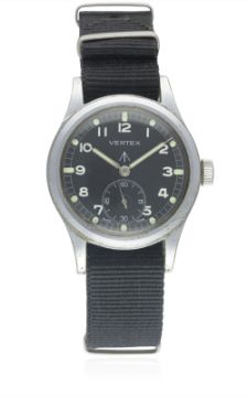 A GENTLEMAN'S BRITISH MILITARY VERTEX W.W.W. WRIST WATCH CIRCA 1940s, PART OF THE "DIRTY DOZEN"Movement: 15J, manual wind, signed Vertex.Case: Diameter approx. 36mm, fixed bars, nickel plated case with steel screw back, issue markings W.W.W. ^ A 4655 3517571, lug numbered 673.Strap: NATO. CONDITION REPORTDial: Original dial in excellent condition, showing some light hand drag in subsidiary seconds. Movement: Working at present.Case: In good condition, with small scratches due to use.Strap/Bracelet: In excellent condition.