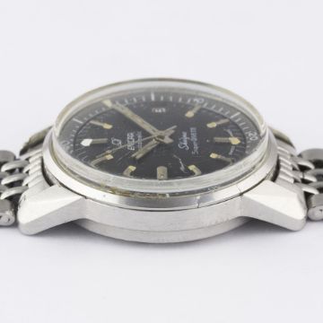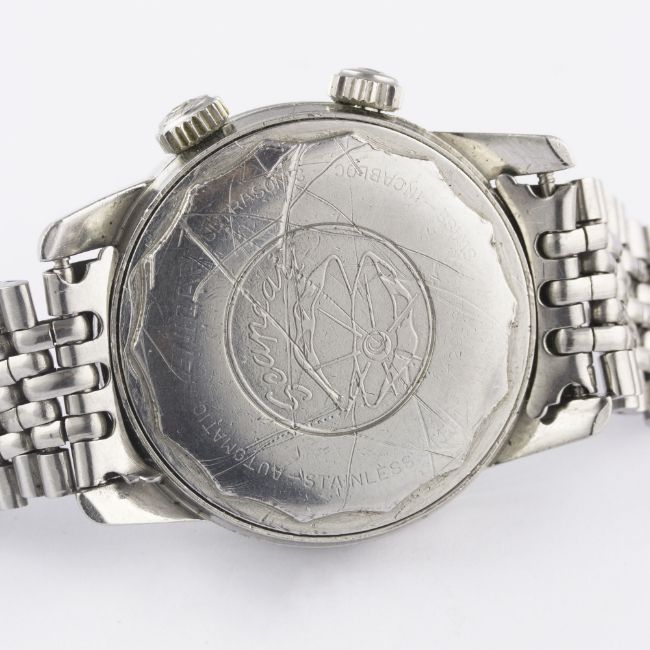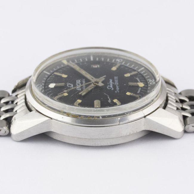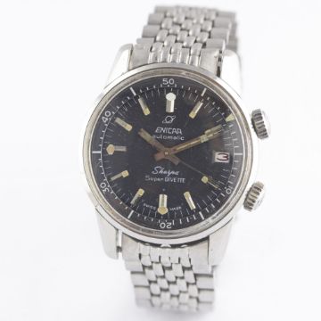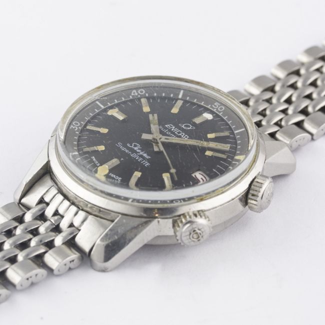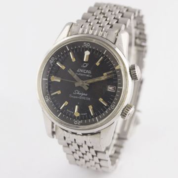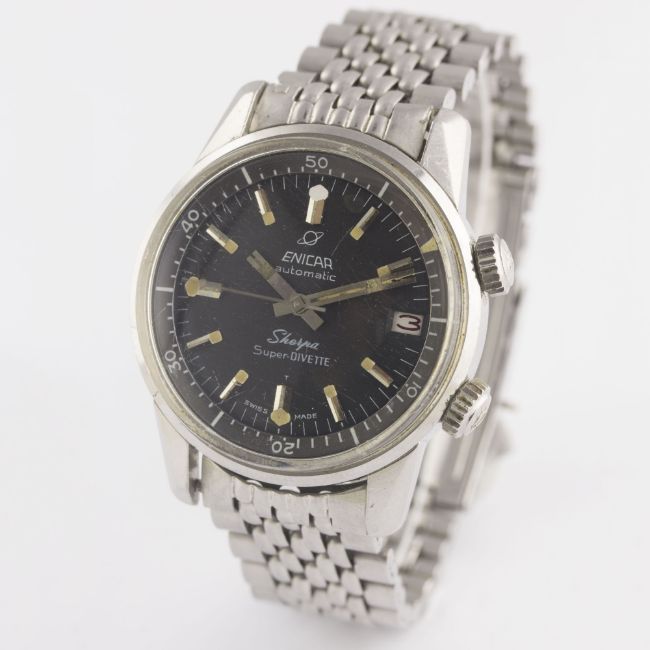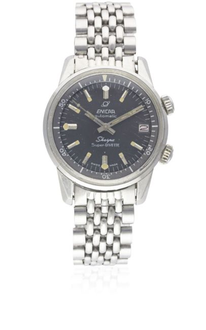 A GENTLEMAN'S STAINLESS STEEL ENICAR SHERPA SUPER DIVETTE AUTOMATIC DIVERS BRACELET WATCH CIRCA 1960s, REF. 144-35-021Movement: Automatic, signed Enicar.Case: Diameter approx. 36mm, super compressor, Seapearl emblem embossed on case back, signed Enicar Watch Co, numbered, Enicar anti-slip crowns.Bracelet: Enicar "beads of rice" bracelet. CONDITION REPORTDial: Original dial in excellent condition, showing some very small signs of age.Movement: Working at present.Case: In good condition, with scratches to case back due to opening.Strap/Bracelet: In good condition, with light scratches due to general use, one small dent to clasp.