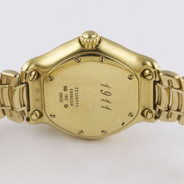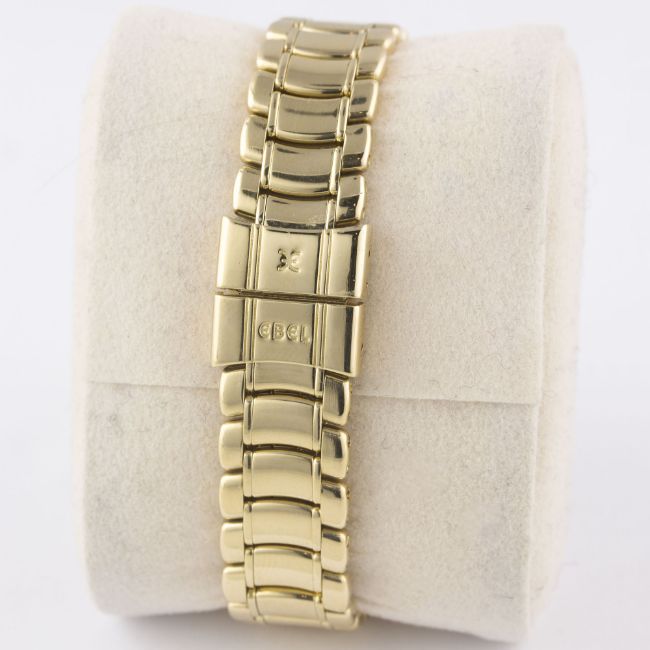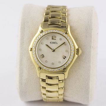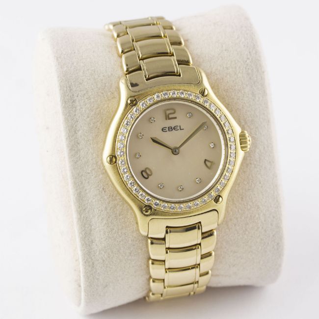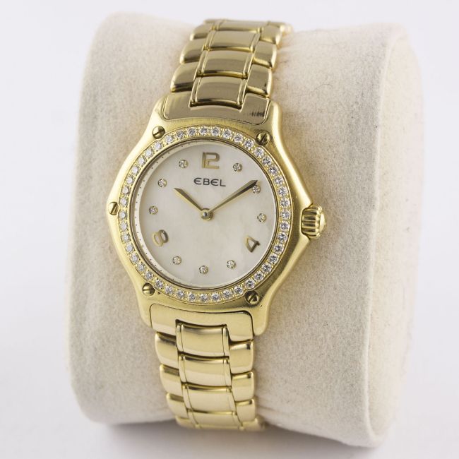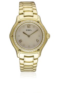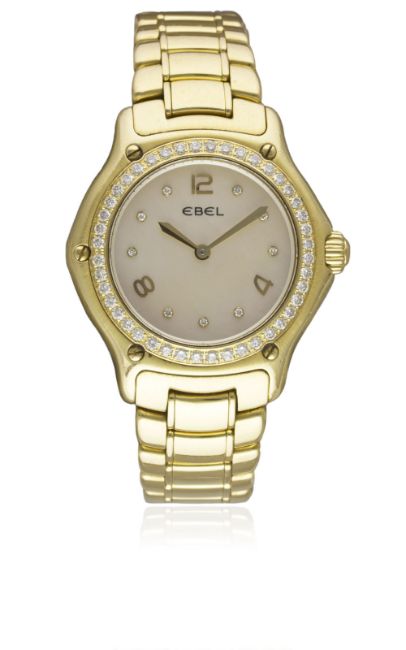 A LADIES 18K SOLID GOLD & DIAMOND EBEL 1911 BRACELET WATCHCIRCA 2000s, REF. E8090224 WITH ORIGINAL PINK MOTHER OF PEARL DIAMOND DIALMovement: Quartz, signed Ebel.Case: Diameter approx. 30mm, signed 1911, numbered, original set diamond bezel, 18k hallmarks, original crown. Bracelet: Original 18k solid gold Ebel bracelet, total length approx. 148mm. CONDITION REPORTDial: Original dial in excellent condition.Movement: Working at present.Case: In excellent condition, with some very light scratches due to general use.Strap/Bracelet: In excellent condition with very light scratches
