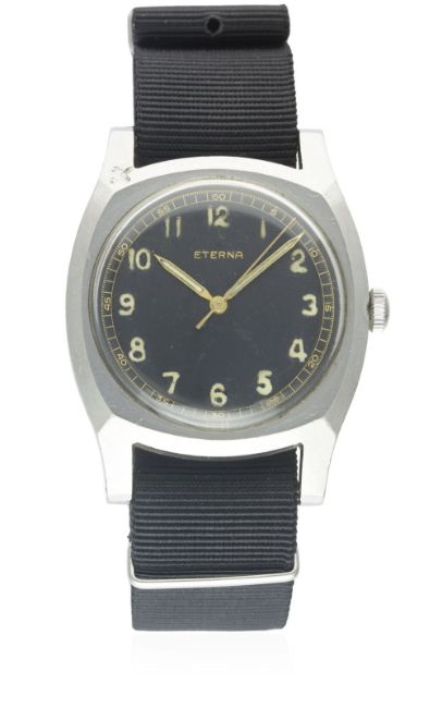 A RARE GENTLEMAN'S STAINLESS STEEL CZECH MILITARY AIR FORCE ETERNA PILOTS WRIST WATCH CIRCA 1940sMovement: Manual wind, cal. 852 S, signed Eterna, numbered.Case: Width approx. 38mm, screw back, signed Eterna Watch Co., numbered 3358220 on inside & outside case back, double sword insignia marked on top left lug.Strap: NATO. CONDITION REPORTDial: Original dial in very good condition, showing some signs of age.Movement: Working at present.Case: In excellent condition, with some small scratches due to use.Strap/Bracelet: In excellent condition.