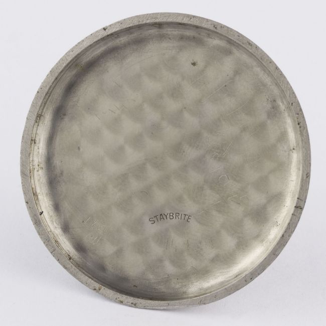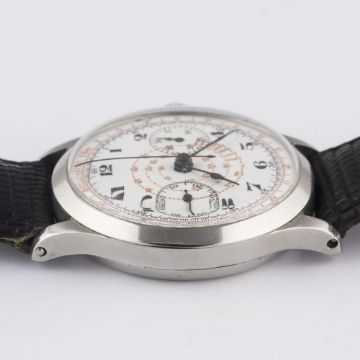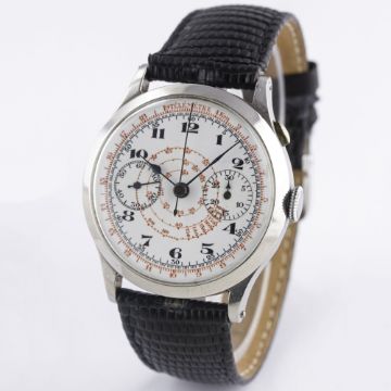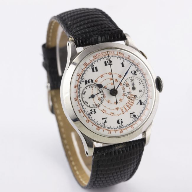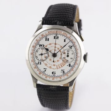 A GENTLEMAN'S LARGE SIZE STAINLESS STEEL SINGLE BUTTON CHRONOGRAPH WRIST WATCH CIRCA 1930s, WITH ENAMEL DIALMovement: Manual wind.Case: Diameter approx. 39mm, snap back, marked Staybrite, numbered.Strap: Leather. CONDITION REPORTDial: Original dial in good condition, a small chip just below 2 o'clock next to the bezel.Movement: Working at present.Case: In very good condition, with some scratches due to general use.Strap/Bracelet: In fair condition.