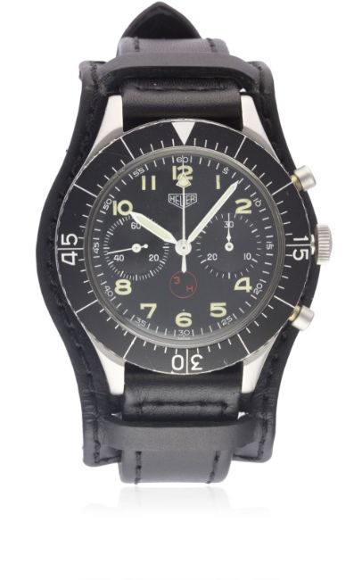 A GENTLEMAN'S STAINLESS STEEL GERMAN MILITARY HEUER "BUND" FLYBACK CHRONOGRAPH WRIST WATCH CIRCA 1970, REF. 1550 SGMovement: 17J, manual wind, Valjoux cal. 230.Case: Diameter approx. 43mm, "clamshell", numbered, 60 minute rotating bezel, issue markings BUNDESWEHR 6645-12-146-3774, original crown & pushers.Strap: BUND leather strap. CONDITION REPORTDial: Original dial in excellent condition.Movement: Working at present.Case: In excellent condition, with some light scratches due to use.Strap/Bracelet: In excellent condition.