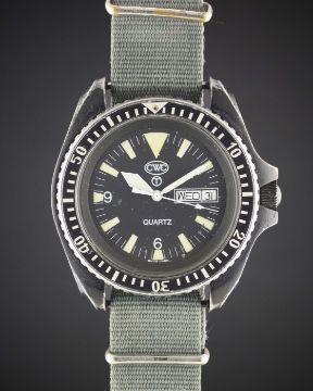 A VERY RARE GENTLEMAN'S PVD STAINLESS STEEL BRITISH MILITARY ROYAL NAVY SBS ISSUED CWC DIVERS WRIST WATCH DATED 1992, FROM ONE OF THE EARLIEST BATCHES ISSUED TO THE SBSMovement: Quartz.Case: Diameter approx. 42mm, fixed bars, screw back, issue markings 0552/6645-99-7995443 ^ 155/92, 60 minute rotating bezel, crown guards, screw-down crown.Strap: NATO. CONDITION REPORTDial: Original dial in excellent condition, with some very small signs of age.Movement: Working at present.Case: In good condition, with some small scratches and wear to the PVD coating due to general use.Strap/Bracelet: In good condition.