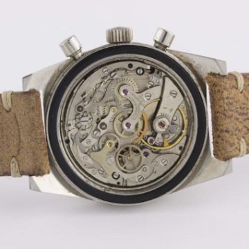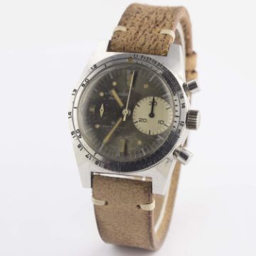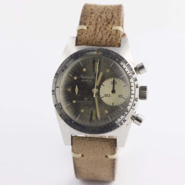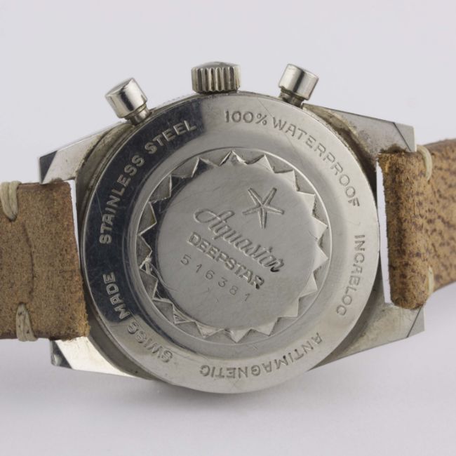 A VERY RARE GENTLEMAN'S STAINLESS STEEL AQUASTAR DEEPSTAR 10 ATM "BIG EYE" DIVERS CHRONOGRAPH WRIST WATCH CIRCA 1965, WITH "TROPICAL" DIAL, THE MODEL AS WORN AND TESTED BY JACQUES COUSTEAU AND HIS DIVING TEAM ONBOARD THE VESSEL "CALYPSO" Movement: 17J, manual wind, Valjoux cal. 23, signed Aquastar Watch Co.Case: Width approx. 38mm, screw back, signed Aquastar Deepstar with starfish emblem embossed, numbered, rotating bezel with Deepstar scale allowing for calculation of aggregate diving times for successive dives without use of conventional diving tables, Aquastar crown.Strap: Leather. CONDITION REPORTDial: Original dial in very good "tropical" condition, showing signs of age.Movement: Working at present.Case: In excellent condition, with small scratches due to general use.Strap/Bracelet: In excellent condition.