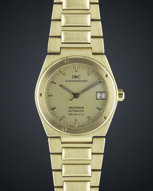 A FINE & RARE GENTLEMAN'S 18K SOLID GOLD IWC INGENIEUR 500.000A/M AUTOMATIC BRACELET WATCH CIRCA 1990, REF. 9238 OF WHICH ONLY 137 PIECES WERE KNOWN TO HAVE BEEN PRODUCED WITH THE INFAMOUS CAL. 35790 ANTIMAGNETIC MOVEMENTMovement: 21J, automatic, cal. 35790, signed International Watch Co.Case: Width approx. 34mm, screw back, signed International Watch Co., hallmarked, numbered, 500.000A/m engraved on side of case, IWC screw-down crown.Bracelet: Original IWC Ingenieur 18k solid gold bracelet with flip-lock clasp. CONDITION REPORTDial: Original dial in excellent condition.Movement: Working at present.Case: In excellent condition.Strap/Bracelet: In excellent condition, with some light scratches due to general use.