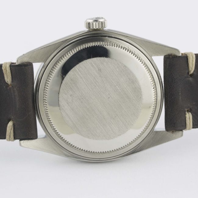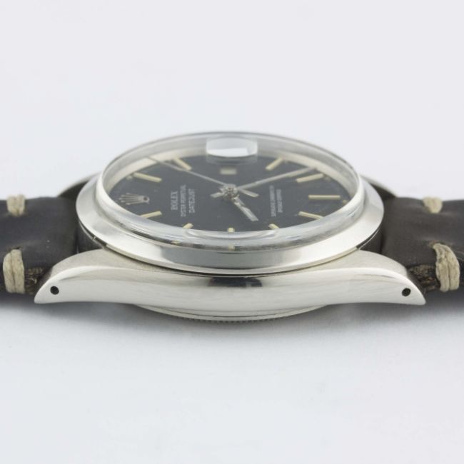 A RARE GENTLEMAN'S STAINLESS STEEL ROLEX OYSTER PERPETUAL DATEJUST WRIST WATCHCIRCA 1974, REF. 1600 WITH MATT BLACK DIALMovement: 26J, automatic chronometer, cal. 1570, signed Montres Rolex S.A., numbered.Case: Diameter approx. 36mm, Oyster case, signed Montres Rolex S.A., numbered, smooth bezel, Rolex crown.Strap: Leather. CONDITION REPORTDial: Original dial in very good condition, showing some small signs of age.Movement: Working at present.Case: In excellent condition, with some light scratches due to general use.Strap/Bracelet: In excellent condition.
