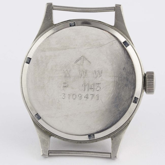 A RARE GENTLEMAN'S STAINLESS STEEL BRITISH MILITARY ETERNA W.W.W. WRIST WATCH CIRCA 1940s, PART OF THE "DIRTY DOZEN"Movement: 15J, manual wind, cal. 520H, signed Eterna, numbered.Case: Diameter approx. 36mm, fixed bars, screw back, signed Eterna Watch Co, issue markings ^ W.W.W. P 1143 3109471, dust cover.Strap: NATO. CONDITION REPORTDial: Original dial in excellent condition, showing some small signs of age.Movement: Working at present.Case: In very good condition, with small scratches due to use.Strap/Bracelet: In excellent condition.