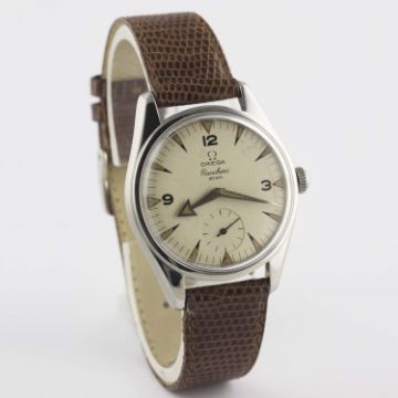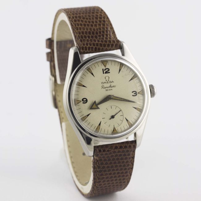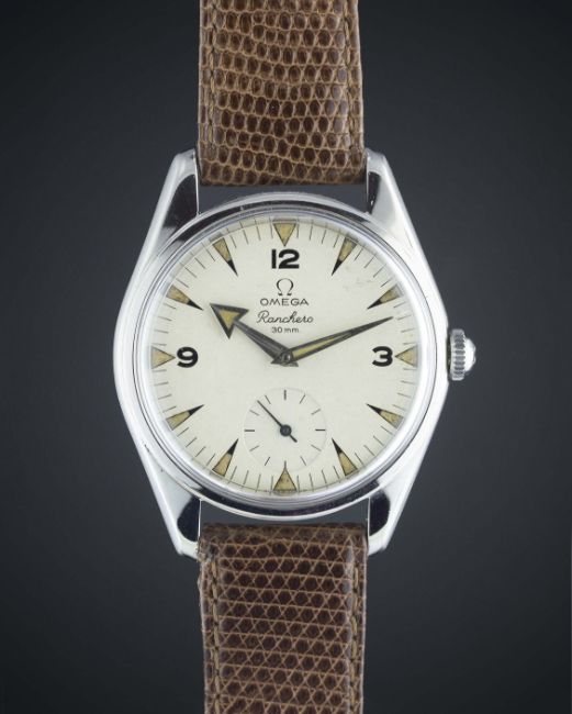 A RARE GENTLEMAN'S STAINLESS STEEL OMEGA RANCHERO WRIST WATCH DATED 1958, REF. 2990 1 WHITE DIAL WITH "BROAD ARROW" HANDS, ACCOMPANIED BY OMEGA EXTRACT OF THE ARCHIVES SHOWING DELIVERY TO ITALYMovement: 17J, manual wind, cal. 267, signed Omega, numbered. Case: Diameter approx. 36mm, snap back, signed Omega Watch Co, Omega crown.Strap: Leather. CONDITION REPORTDial: Original dial in very good condition, showing some small signs of age.Movement: Working at present.Case: In very good condition, with small scratches due to general use.Strap/Bracelet: In very good condition.