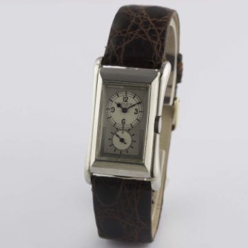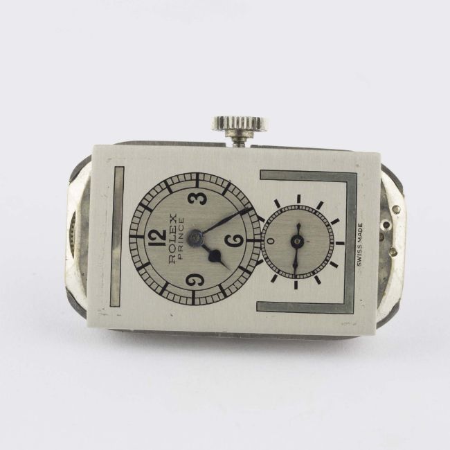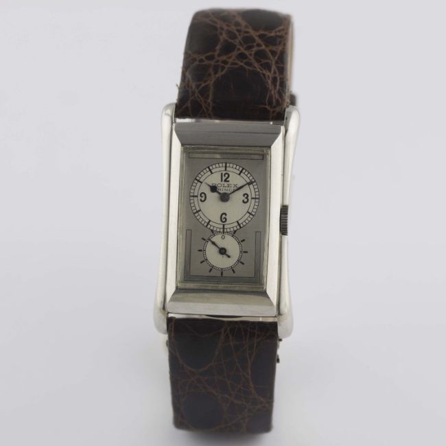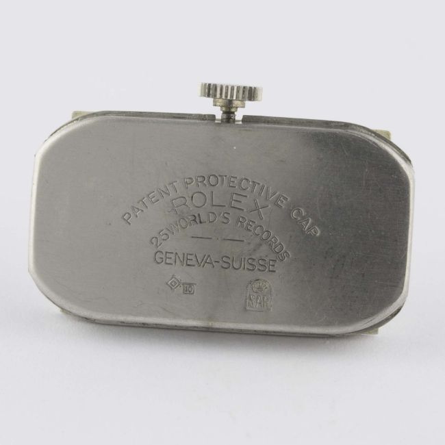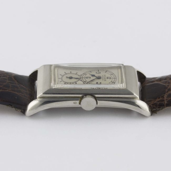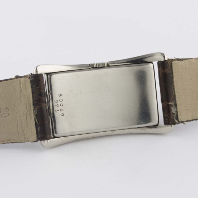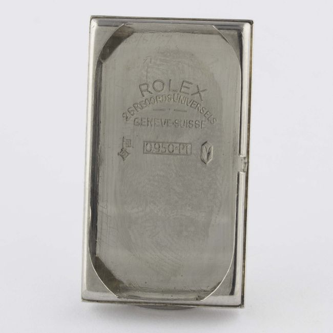 Case: Approx. 43mm by 26mm, waisted rectangular case, Patent Protective Cap, signed Rolex 25 Records Universels, case top marked with the last two digits of the serial number, Platinum hallmarks.