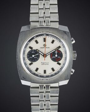 A GENTLEMAN'S STAINLESS STEEL CERTINA ARGONAUT CHRONO CHRONOGRAPH BRACELET WATCH CIRCA 1970, REF. 8401 001 WITH "PANDA" DIAL, ACCOMPANIED BY CERTINA BOXMovement: 17J, manual wind, Certina cal. 29-053, Valjoux base cal. 23, signed Certina.Case: Width approx. 38mm, screw back, signed Certina, numbered, Certina crown.Bracelet: Certina bracelet with flip-lock clasp, numbered 6301.  CONDITION REPORTDial: Original dial in excellent condition, showing some very small signs of age.Movement: Working at present.Case: In excellent condition, with light scratches due to general use.Strap/Bracelet: In excellent condition, with light scratches due to general use.