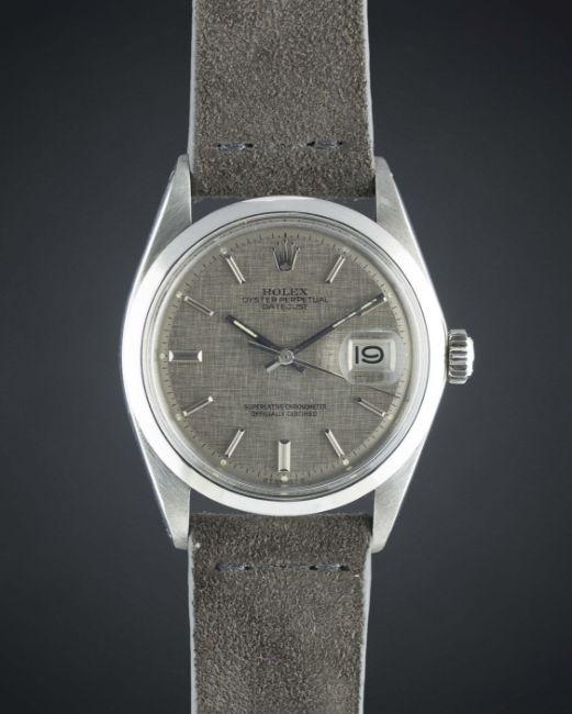 A GENTLEMAN'S STAINLESS STEEL ROLEX OYSTER PERPETUAL DATEJUST WRIST WATCHCIRCA 1971, REF. 1600 WITH GREY LINEN "SIGMA" DIALMovement: 26J, automatic chronometer, cal. 1570, signed Montres Rolex S.A., numbered.Case: Diameter approx. 36mm, Oyster case, signed Montres Rolex S.A., dated IV.71, numbered, smooth bezel, Rolex crown.Strap: Suede. CONDITION REPORTDial: Original dial in excellent condition.Movement: Working at present.Case: In excellent condition, with some small scratches due to general use.Strap/Bracelet: In excellent condition.
