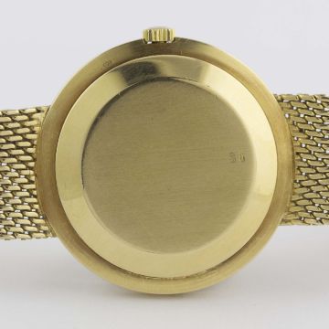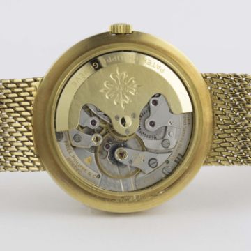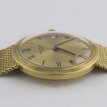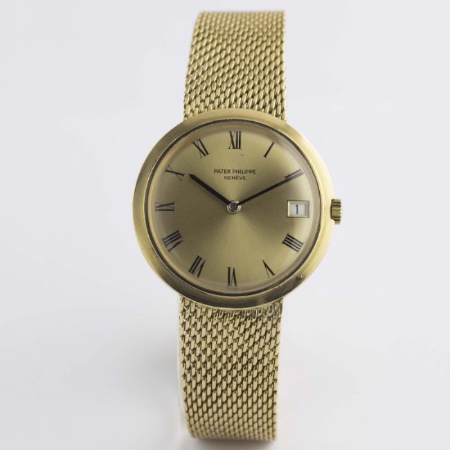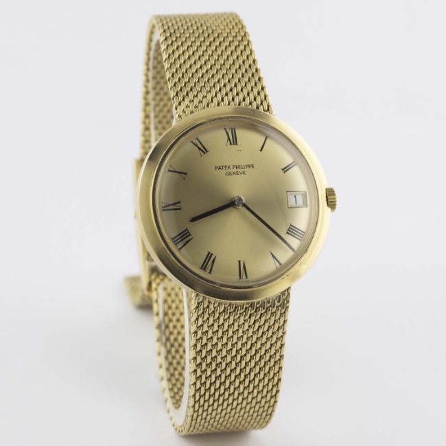 A RARE GENTLEMAN'S 18K SOLID GOLD PATEK PHILIPPE CALATRAVA AUTOMATIC BRACELET WATCH CIRCA 1978, REF. 3565 1 Movement: 37J, automatic with 22ct solid gold rotor, cal. 27-460M, signed Patek Philippe & Co, numbered.Case: Diameter approx. 35mm, snap back, signed Patek Philippe & Co, numbered, 18k hallmarks, Patek Philippe crown.Strap: Original 18k solid gold Patek Philippe integral bracelet, total length approx. 230mm. CONDITION REPORTDial: Original dial in excellent condition, very small mark below 12 o'clock.Movement: Working at present.Case: In excellent condition, with some light scratches due to general use.Strap/Bracelet: In excellent condition, with some light scratches due to general use.