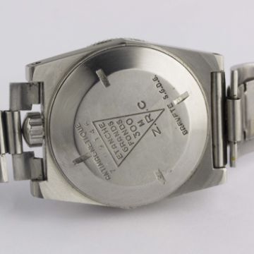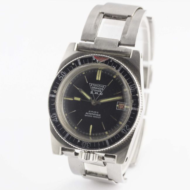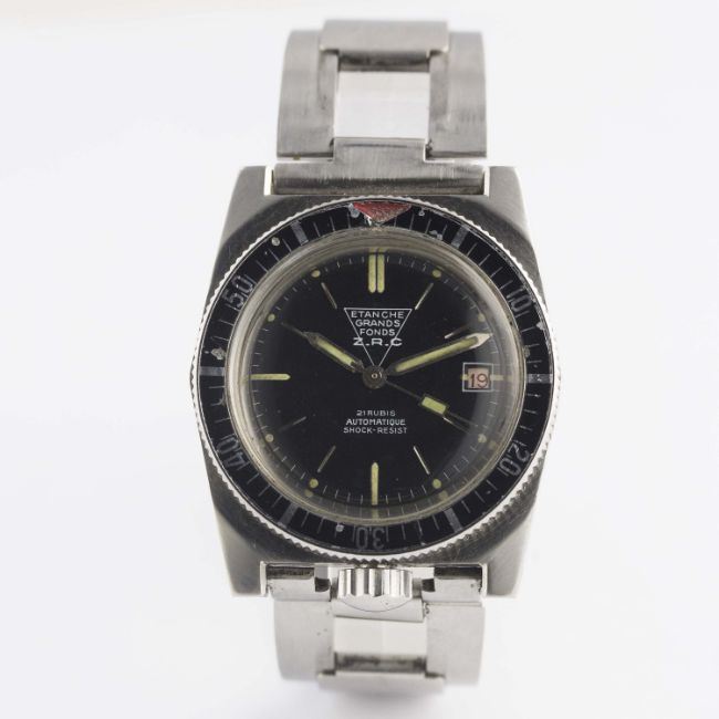 A VERY RARE GENTLEMAN'S STAINLESS STEEL Z.R.C. ETANCHE GRANDS FONDS 300M "SERIES III" AUTOMATIC DIVERS BRACELET WATCH CIRCA 1960s, USED BY MARINE NATIONALE DIVERS AT THE FRENCH NAVY BASE IN TOULONMovement: Automatic, ETA cal. 2472.Case: Width approx. 36mm, screw back, swivel component at bottom lugs to form crown guard, signed Etanche Grands Fonds 300M Z.R.C in triangular form, numbered, Brevete S.G.D.G patent mark, original anti-magnetic dust cover, 60 minute rotating bezel in only one direction to prevent accidental extension of diving period, original screw-down crown.Bracelet: Original Z.R.C. extendable divers bracelet with locking clasp system. CONDITION REPORTDial: Original dial in very good condition, showing some small signs of age.Movement: Working at present.Case: In excellent condition, with some small scratches due to general use.Strap/Bracelet: In very good condition, with some light scratches due to general use.