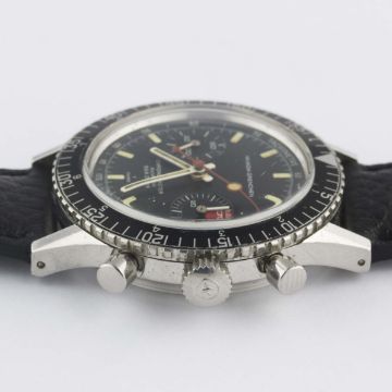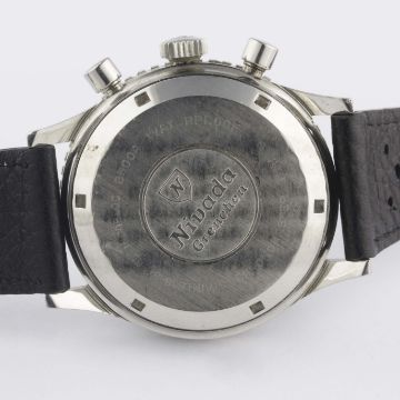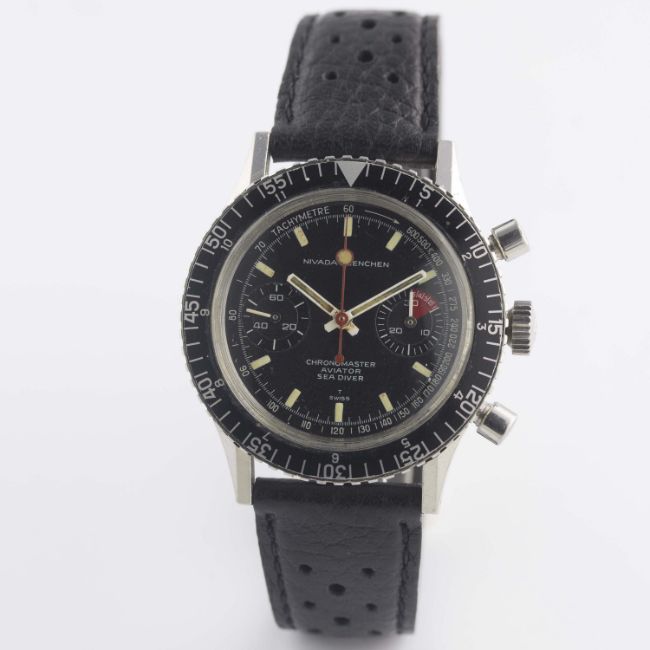 A GENTLEMAN'S STAINLESS STEEL NIVADA GRENCHEN CHRONOMASTER AVIATOR SEA DIVER CHRONOGRAPH WRIST WATCH CIRCA 1960s, REF. 85004Movement: 17J, manual wind, Valjoux cal. 23, signed Nivada.Case: Diameter approx. 39mm, screw back, signed Nivada Grenchen, numbered, MH rotating bezel, Nivada crown.Strap: Perforated leather.    CONDITION REPORTDial: Original dial in very good condition, showing some small signs of age. Movement: Working at present. Case: In very good condition, with light scratches due to general use. Strap/Bracelet: In excellent condition.