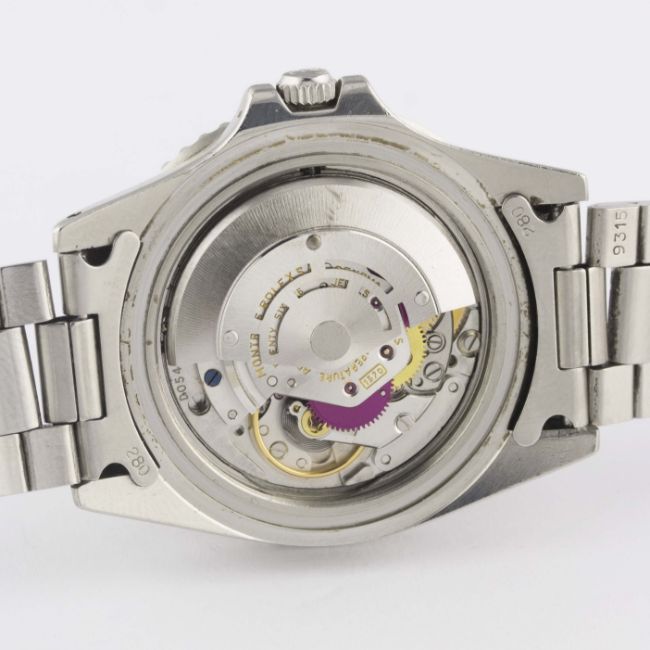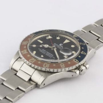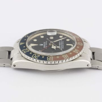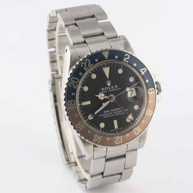 A RARE GENTLEMAN'S STAINLESS STEEL ROLEX OYSTER PERPETUAL DATE GMT MASTER BRACELET WATCHDATED 1974, REF. 1675 WITH MK2 MATT DIAL, ACCOMPANIED BY THE ORIGINAL BOX, GUARANTEE, PURCHASE BOOKLETS, STOCK TAG WITH SERIAL NUMBER AND ADDITIONAL "PEPSI" BEZEL, CONSIGNED BY THE ORIGINAL OWNER Movement: 26J, automatic chronometer, cal. 1570, signed Montres Rolex S.A, numbered.Case: Diameter approx. 40mm, Oyster case, signed Montres Rolex S.A., dated II.71, numbered, "fat font" 24 hour rotating "Pepsi" bezel, Rolex crown.Bracelet: Originally requested Rolex Oyster bracelet with flip-lock clasp & extension, numbered 9315/280, dated 3/71. CONDITION REPORTDial: Original dial in excellent condition.Movement: Working at present.Case: In very good condition, with small scratches due to general use, small crack in the edge of the plexiglass.Strap/Bracelet: In good condition, with light scratches & stretch.