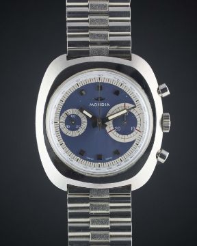 A GENTLEMAN'S STAINLESS STEEL MONDIA "BIG EYE" CHRONOGRAPH BRACELET WATCH CIRCA 1970 Movement: 17J, manual wind, Valjoux cal. 7733, signed Mondia.Case: Width approx. 39mm, screw back, signed Mondia, numbered, Mondia crown. Bracelet: Original Mondia NSA bracelet. CONDITION REPORTDial: Original dial in excellent condition, showing some very small signs of age.Movement: Working at present.Case: In excellent condition, with some light scratches due to general use.Strap/Bracelet: In excellent condition, with some light scratches due to general use.