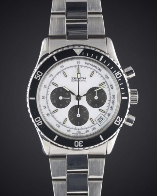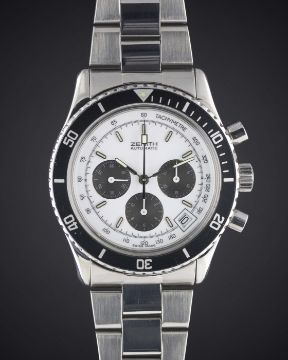 Case: Diameter approx. 40mm, screw back, signed Zenith with emblem engraved on case back, 60 minute rotating bezel, Zenith crown.