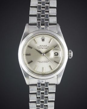 A GENTLEMAN'S STAINLESS STEEL ROLEX OYSTER PERPETUAL DATEJUST BRACELET WATCHCIRCA 1965, REF. 1603 WITH "DAGGER" HANDSMovement: 26J, automatic chronometer, cal. 1570, signed Montres Rolex S.A., numbered.Case: Diameter approx. 36mm, Oyster case, signed Montres Rolex S.A., dated IV.65, numbered, replacement smooth bezel, Rolex crown.Bracelet: Rolex Jubilee bracelet, numbered K2/6251H/55. CONDITION REPORTDial: Original dial in excellent condition, showing some small signs of age.Movement: Working at present.Case: In good condition, with scratches due to general use.Strap/Bracelet: In very good condition, with light scratches due to general use.
