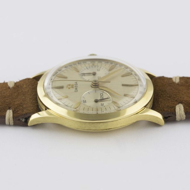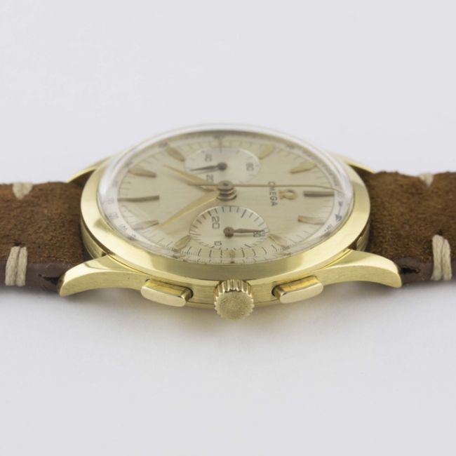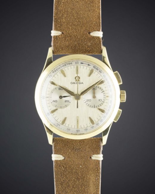 A RARE GENTLEMAN'S 18K SOLID GOLD OMEGA CHRONOGRAPH WRIST WATCH CIRCA 1960, REF. OT 2872 15 BRUSHED DIAL WITH "COFFIN" MARKERS & "DAGGER" HANDSMovement: 17J, manual wind, cal. 320, signed Omega Watch Co, numbered. Case: Diameter approx. 35mm, snap back, signed Omega Watch Co, 18k hallmarks.Strap: Suede. CONDITION REPORTDial: Original dial in excellent condition, showing some small signs of age.Movement: Working at present.Case: In excellent condition, some very light dents to case back due to general use.Strap/Bracelet: In excellent condition.