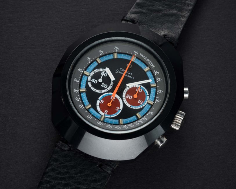 A VERY RARE GENTLEMAN'S STAINLESS STEEL OMEGA SEAMASTER "DARTH VADER' CHRONOGRAPH WRIST WATCHCIRCA 1970s, REF. 145.023 PRE-SERIES WITH UNNUMBERED MOVEMENT Movement: 17J, manual wind, cal. 861, signed Omega. Case: Width approx. 44mm, black tungsten outer top shell, screw back, Seamaster emblem on case back, signed Omega Watch Co, Omega crown.Strap: Leather. CONDITION REPORTDial: Original dial in excellent condition, showing some very small signs of age.Movement: Working at present.Case: In very good condition, with some small scratches, some small signs of wear to tungsten shell between lugs.Strap/Bracelet: In excellent condition.