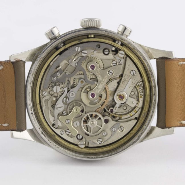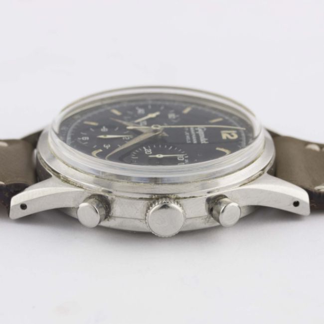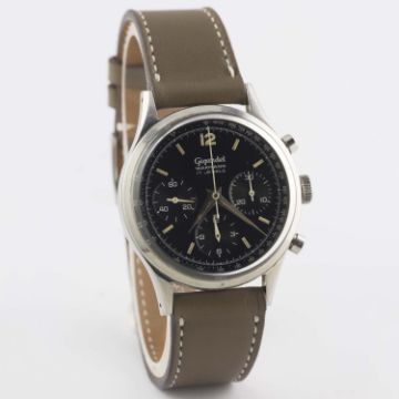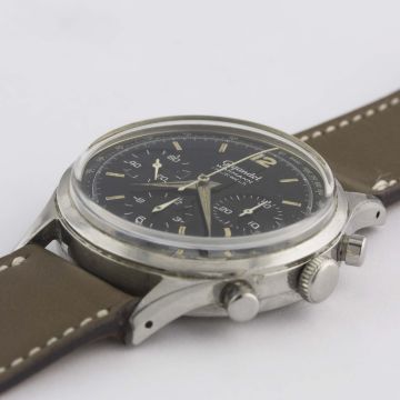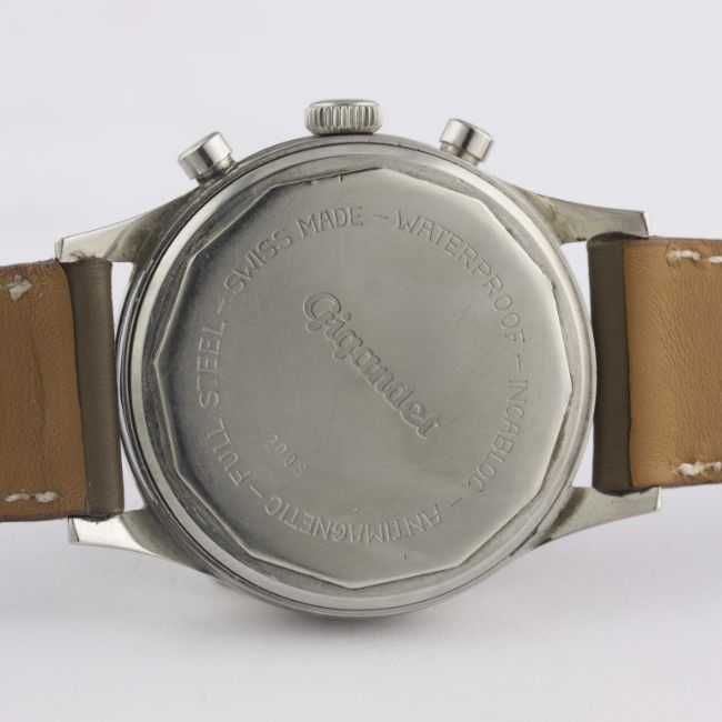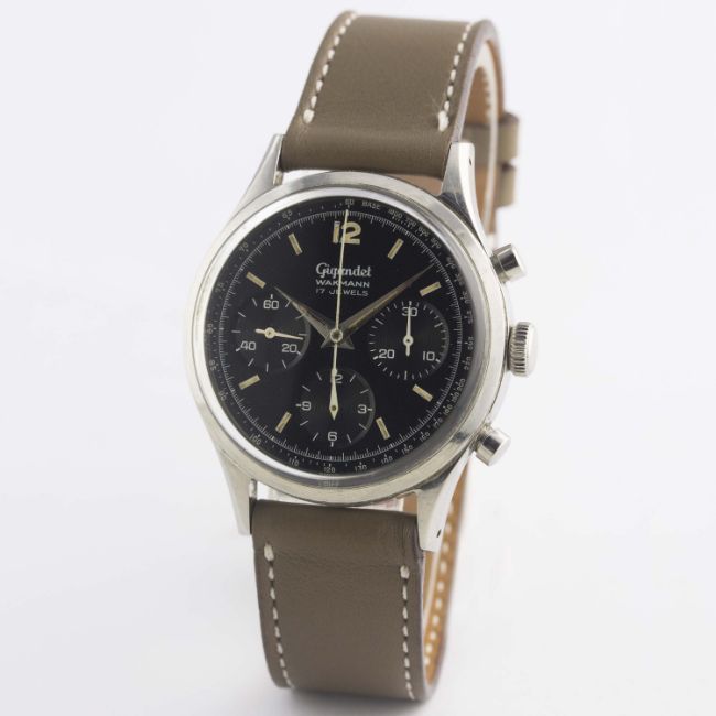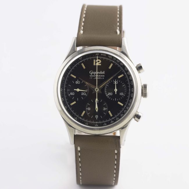 A RARE GENTLEMAN'S STAINLESS STEEL GIGANDET WAKMANN CHRONOGRAPH WRIST WATCH CIRCA 1960s, WITH GLOSS BLACK DIALMovement: 17J, manual wind, Valjoux cal. 72, signed Wakmann Watch Co Inc.Case: Diameter approx. 37mm, screw back, signed Charles Gigandet, numbered.Strap: Leather. CONDITION REPORTDial: Original dial in excellent condition, showing some very small signs of age.Movement: Working at present.Case: In excellent condition, with some small scratches due to general use.Strap/Bracelet: In excellent condition.