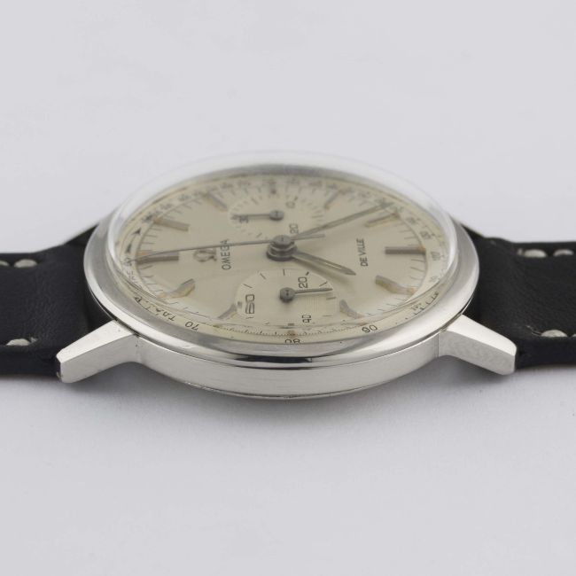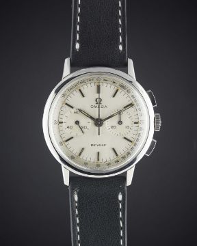 A RARE GENTLEMAN'S STAINLESS STEEL OMEGA DE VILLE CHRONOGRAPH WRIST WATCH CIRCA 1967, REF. 101.00009-66 WITH TWO TONE SILVER TACHYMETRE DIALMovement: 17J, manual wind, cal. 320, signed Omega, numbered. Case: Diameter approx. 35mm, snap back, signed Omega Watch Co, Omega crown.Strap: Leather. CONDITION REPORTDial: Original dial in excellent condition.Movement: Working at present.Case: In excellent condition.Strap/Bracelet: In excellent condition.
