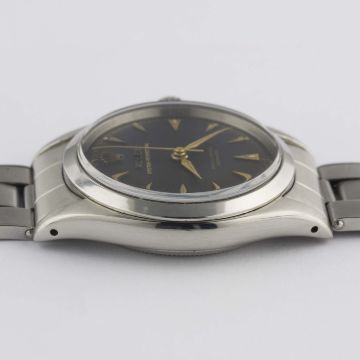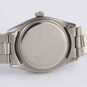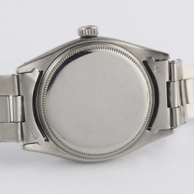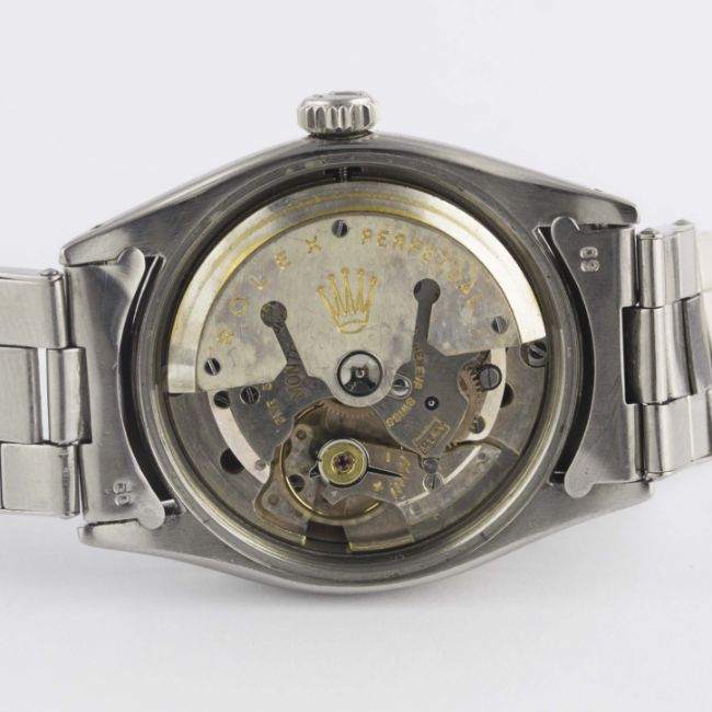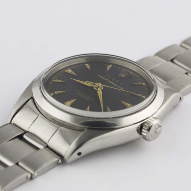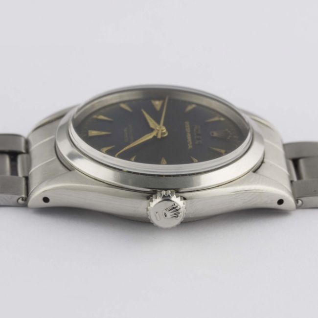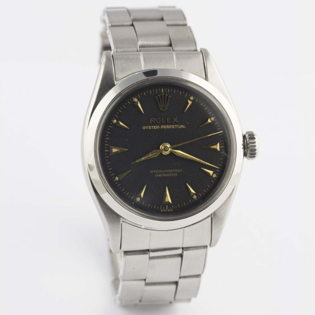 A RARE GENTLEMAN'S STAINLESS STEEL ROLEX OYSTER PERPETUAL BRACELET WATCHCIRCA 1955, REF. 6580 BLACK "HONEYCOMB" DIAL, ACCOMPANIED BY PERIOD ROLEX BOX Movement: 25J, automatic chronometer, "butterfly" rotor, cal. 1030, signed Montres Rolex S.A., numbered.Case: Diameter approx. 34mm, Oyster case, signed Montres Rolex S.A, dated I.55, numbered, Rolex crown.Bracelet: Rolex Oyster riveted bracelet, end links numbered 60, dated 3.68. CONDITION REPORTDial: Original dial in excellent condition, showing some very small signs of age.Movement: Working at present.Case: In excellent condition, with some light scratches due to general use.Strap/Bracelet: In excellent condition, with light scratches due to general use.