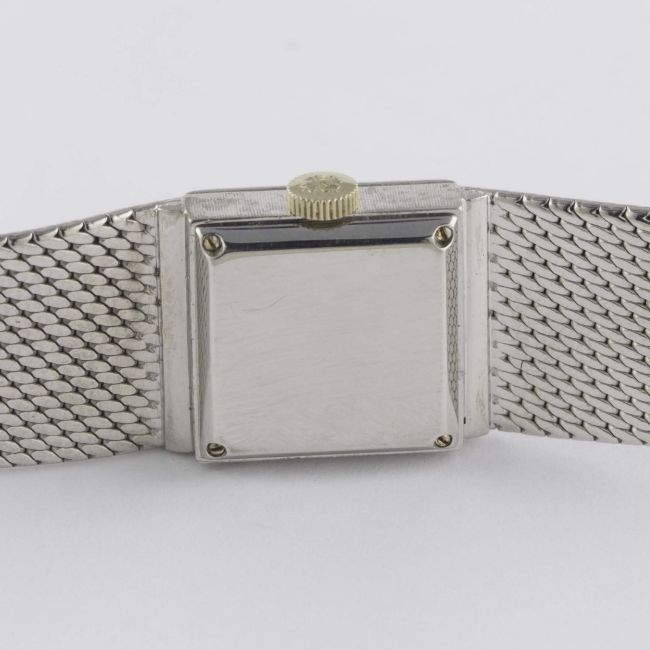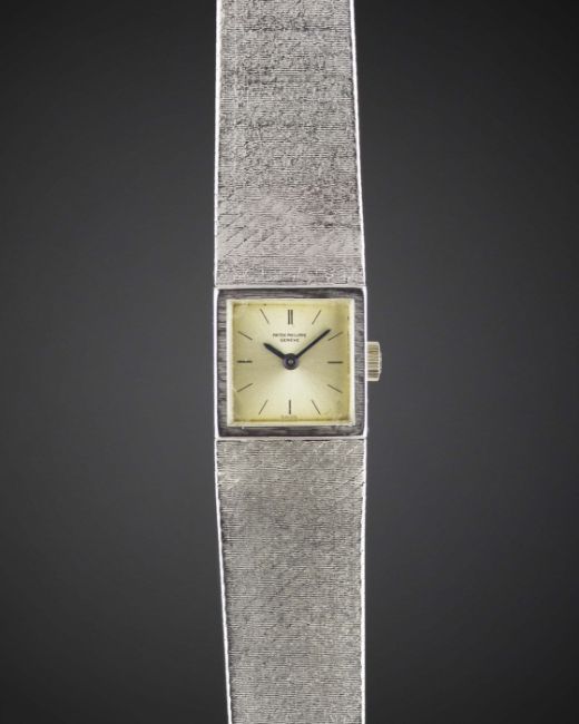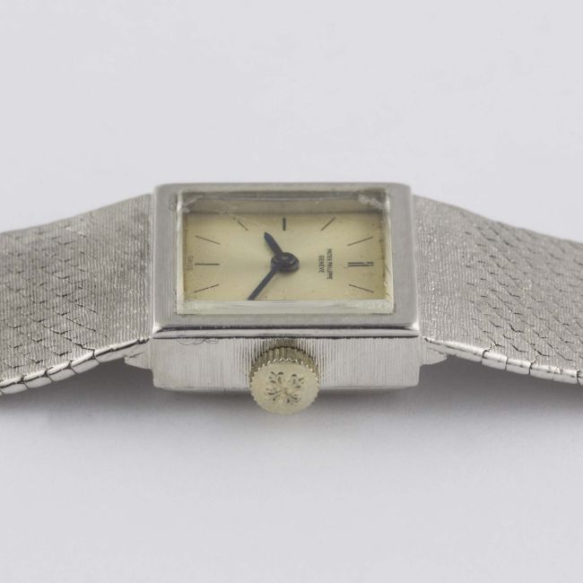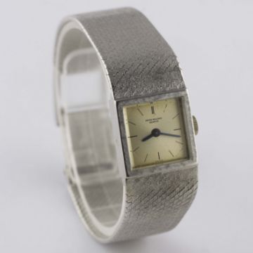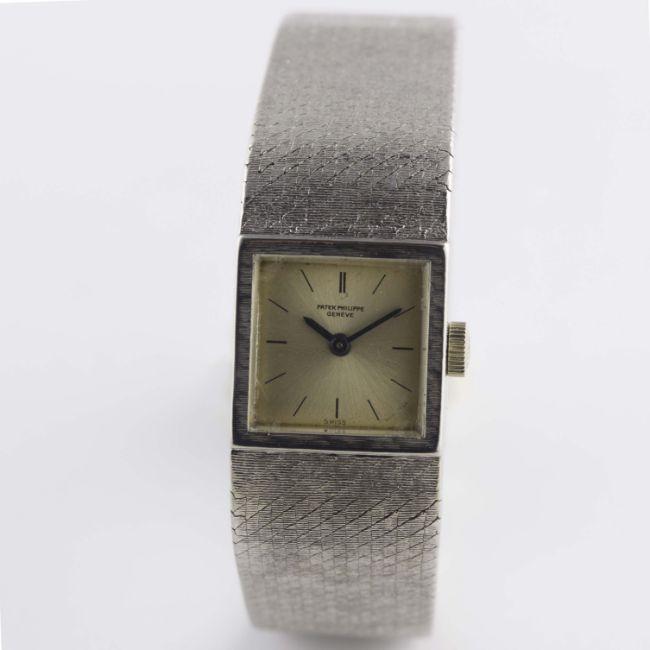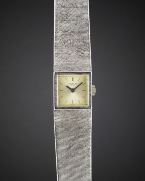 A LADIES 18K SOLID WHITE GOLD PATEK PHILIPPE BRACELET WATCH DATED 1966, REF. 3285/46 WITH ORIGINAL PATEK PHILIPPE GUARANTEE CERTIFICATE Movement: 20J, manual wind, cal. 13.5, signed Patek Philippe, numbered.Case: Width approx. 16mm, case back held shut by four screws, signed Patek Philippe, numbered, 18k hallmarks, Patek Philippe crown. Bracelet: Original 18k solid white gold Patek Philippe integral bracelet, total length approx. 164mm.  CONDITION REPORTDial: Original dial in fair condition, showing signs of age.Movement: Working at present.Case: In very good condition, with light scratches due to general use.Strap/Bracelet: In good condition, with some light wear.